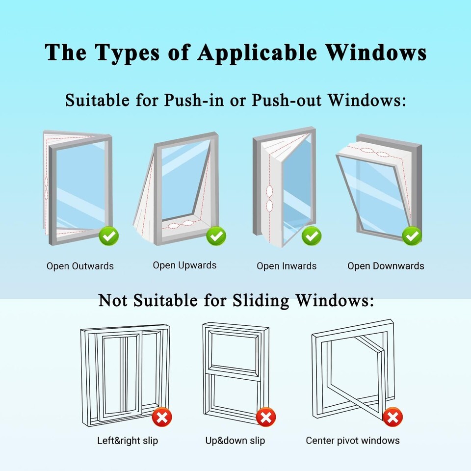 Universal Fit for Casement WindowsOur casement window air conditioner seal kit fits all standard outward-opening or inward-opening windows up to 400CM. Perfect for single or dual hose portable ac window vent kit setups. (Please measure your window size before pur chase.)