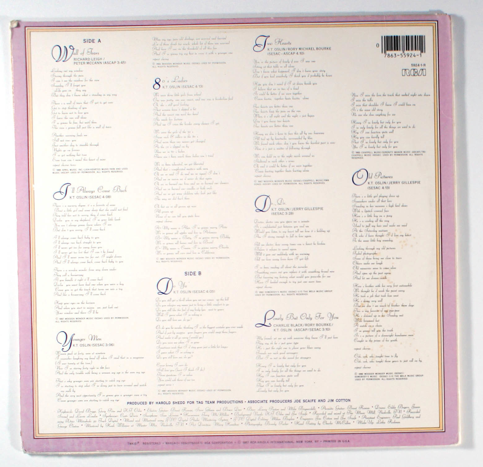80s Ladies by K.T. Oslin featured singles Wall of Tears, the title track, Do Ya' and I'll Always Come Back. The album reached No. 1 on the Top Country Albums chart and has been certified Platinum by the RIAA. Wall of Tears, made No. 40 on the country charts. It was followed by 80's Ladies, which went to No. 7 and won Oslin the Grammy Award for Best Female Country Vocal Performance and Grammy Award for Song of the Year in 1988. Do Ya was Oslin's third country hit and the first of four singles to hit No. 1 on the country chart. The single went to No. 1 for one week and spent a total of sixteen weeks on the country chart.