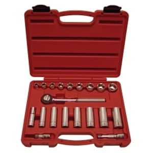 Packaged in a blow molded case Includes 9 short sockets form 3/8 in. to 7/8 in., 8 deep sockets from 3/8 in. to 13/16 in., push button ratchet and 2 in. and 3 in. extensions. Made of heat-treated chrome vanadium steel for durability Marked with product identification and size for ease of use This is an SAE socket set. It has 20-pieces. It is 3/8 in. drive