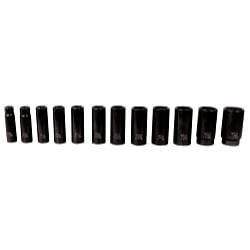 This 12-piece fractional impact set is manufactured from heat-treated chrome-moly steel for wear in professional, rugged environments. Set includes deep sockets sized from 1/2 in.-1-1/4 in. All are 6-point 1/2 in. drive, thin wall. Laser engraved for quick identification. Carded on socket rail.