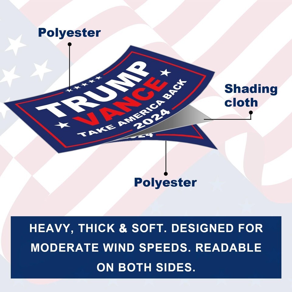 BOLD DOUBLE-SIDED DESIGN - Enjoy a Trump Vance banner that looks great from every angle! The Trump 2024 banners features a striking double-sided design, with a layer of shade cloth in between to eliminate shadows and ensure perfect visibility. Whether youre displaying it outdoors, on a wall, in a room, or from a truck, this Trump flag stands out brilliantly and captures attention from all directions.