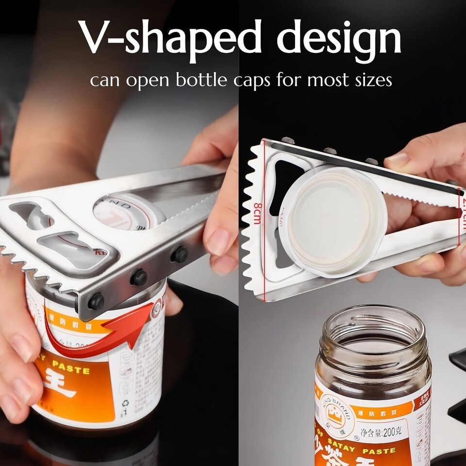 6-in-1 Multi-FunctionalityWith bottle opener, jar opener, can opener, twist-off cap opener, can tab puller, and fish scale scraper/meat tenderizer, our bottle opener is a true all-in-one solution for your kitchen needs. Whether you're popping open a beer bottle, unsealing a jar, or even scraping fish scales, this tool has everything you need. :
