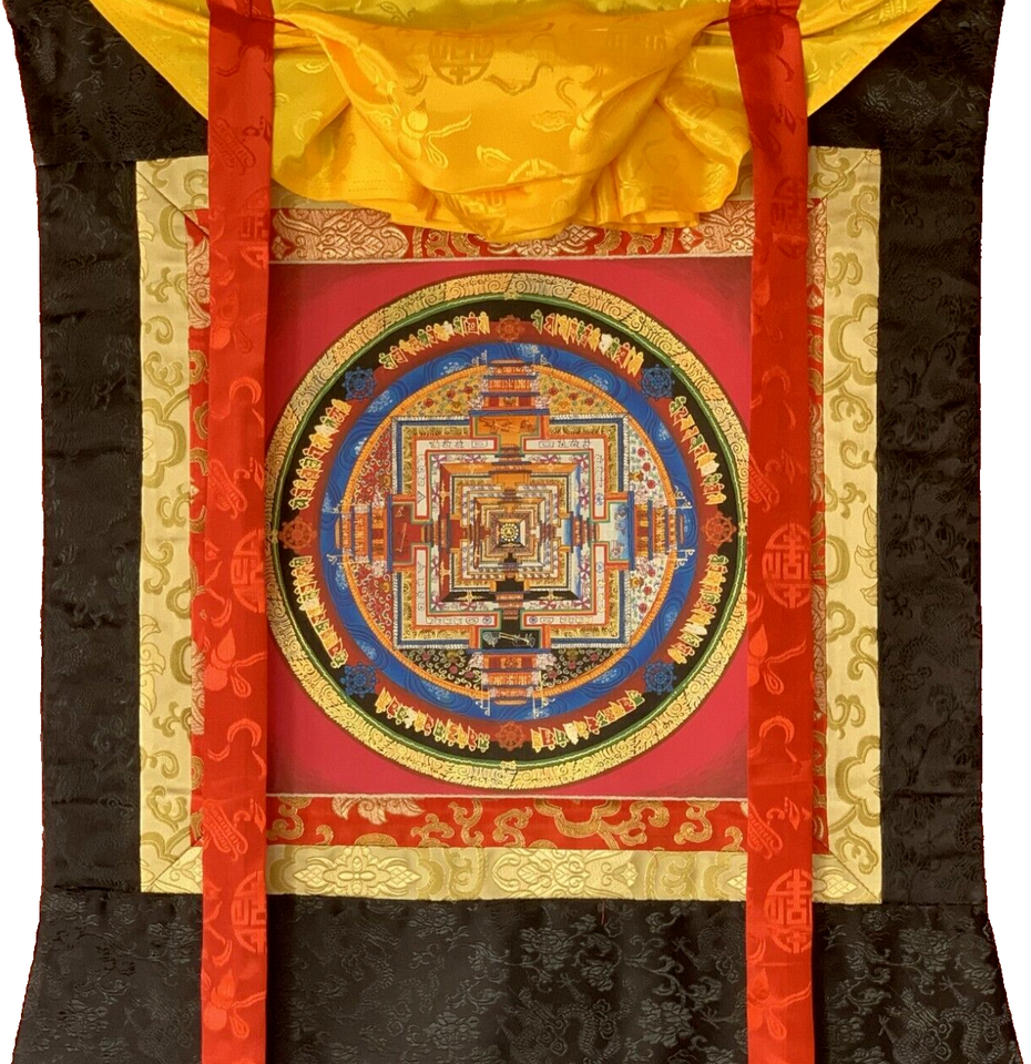 - KALACHAKRA WHEEL OF LIFE MANDALA TIBETAN THANGKA PAINTING WITH SILK BROCADE