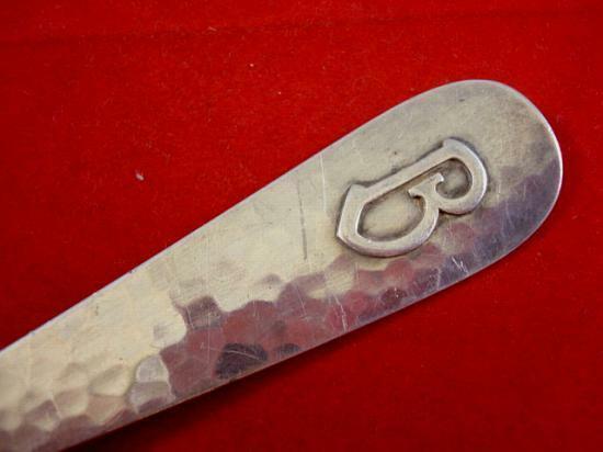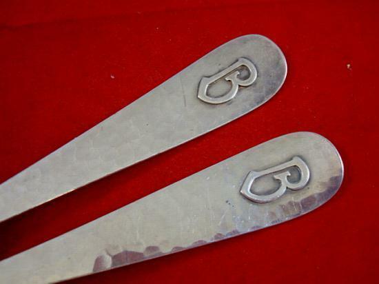 Sterling Silver HANDWROUGHT SALAD SERVING SET made by The Kalo Shop. Chicago Kalo Shop Silversmiths were very important American handwrought silversmiths in the Arts Crafts movement. It has an applied "B" monogram and a wonderful pierced fork. It measures 11 1/2" and is very substantial. Excellent condition.