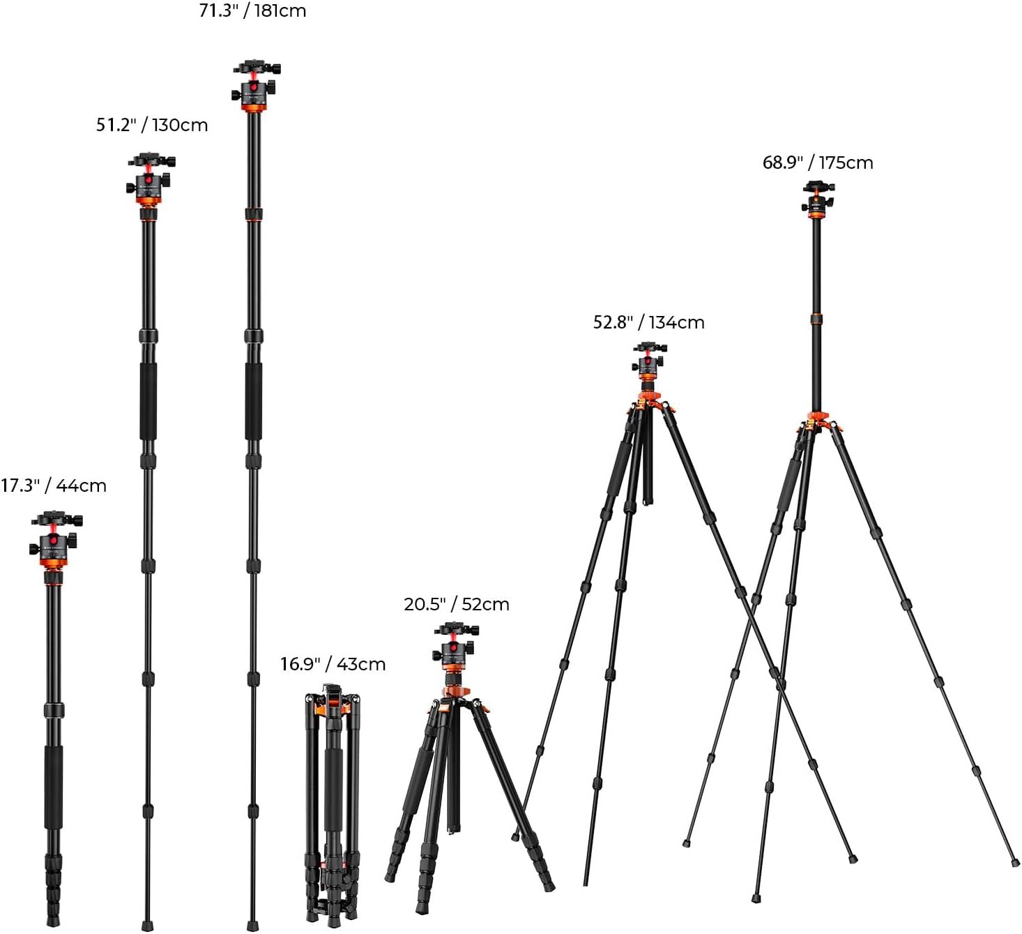 ?Compact Portable? Quality military magnesium aluminum alloy,corrosion resistance; tripod with ball head weighs only 3.30 lbs/1.5kg, it can be 180reflexed and folded to 16.9'', easy to put it in a backpack or suitcase when travel. ?360 PANORAMA?The 28mm large metal ball head provide 10kg load capacity, it can be rotated 360 degrees, helping to expand dslr camera activity range when panoramic shooting. ?Detachable Monopod? It can be turned into a lightweight monopod or walking stick alone to make your photography more diverse. ?EASY SET UP? 5 sections tube leg and the max diameter is 25mm; Spiral type locking knob allows you to adjust the working height in seconds; The height without column reaches 52.7''/134cm and the height with 2 sections center column is 68.8''/175cm,making standing shooting easier. ?Multi-Angle Shooting?Spring self-locking foot tube angle adjustment button, just press and release to quickly adjust the opening and closing angle of the three legs; can help you achieve lowest angle shooting, macro shooting, and other special photography through inverted central axis.