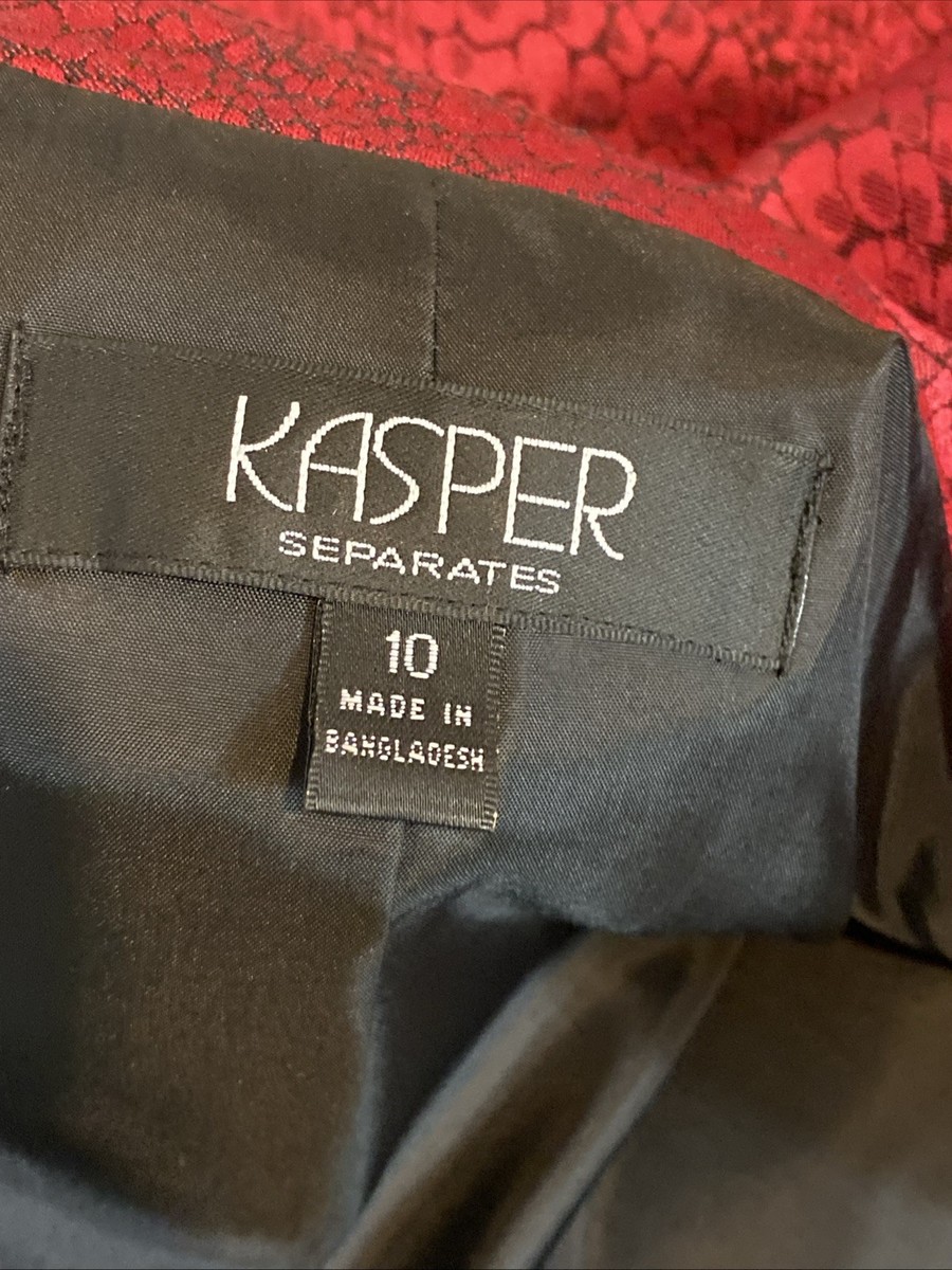 - Kasper Red and Black Print 3/4 Sleeve Lined Open High Collar Jacket Size 10