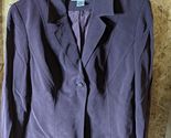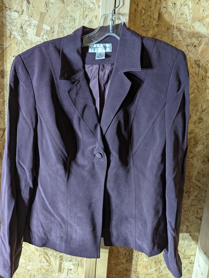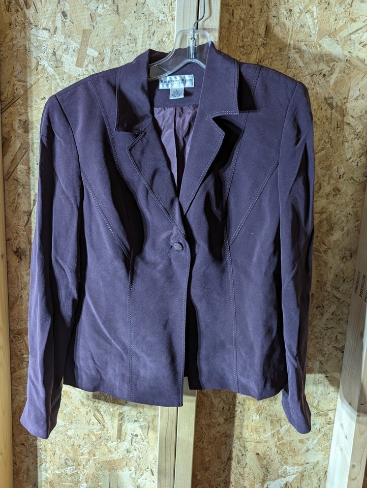 This is a Katherine Kelly ladies blazer made of 100% silk velour in a solid purple color. It has a regular length and long sleeves with no button style. The blazer has a one-button front and a notch lapel style. The chest size is 38 and the lining material is acetate. It is a vintage piece and features a lined interior. The blazer is dry clean only and is not personalized. It is a size 8 and is designed for regular size women.