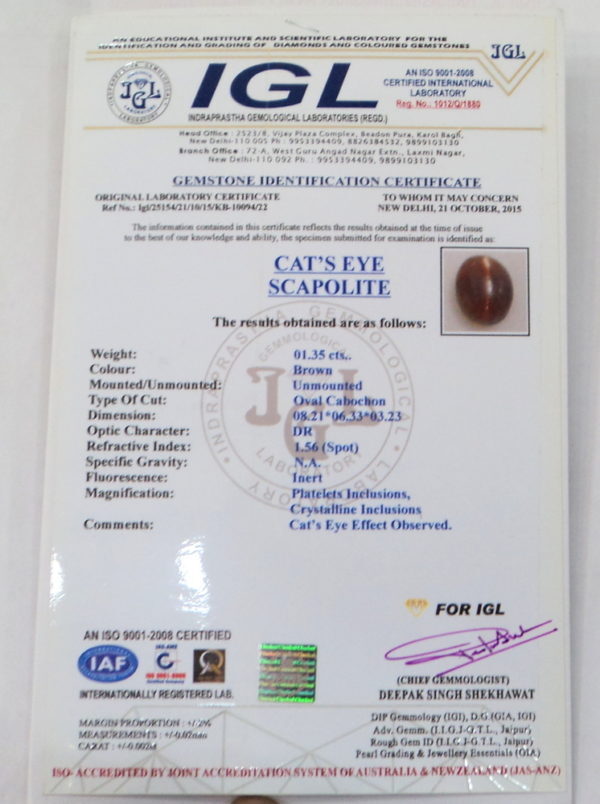 Katzen Augen / Ceylonesisch der - 1.35 Karat - Kunstdiamanten Zertifiziert