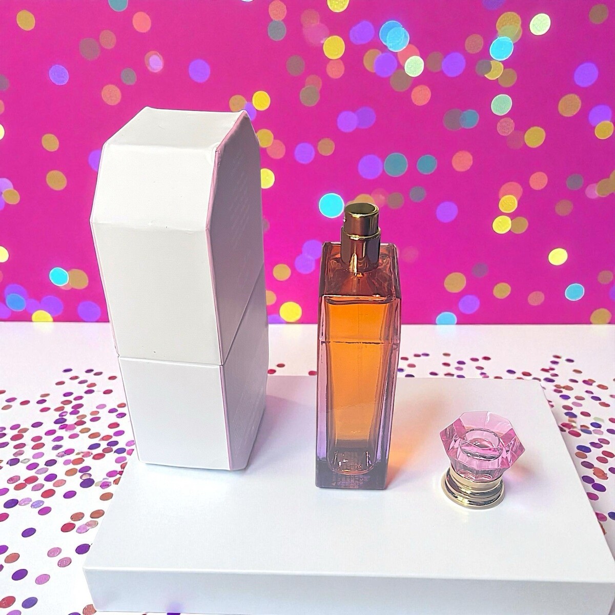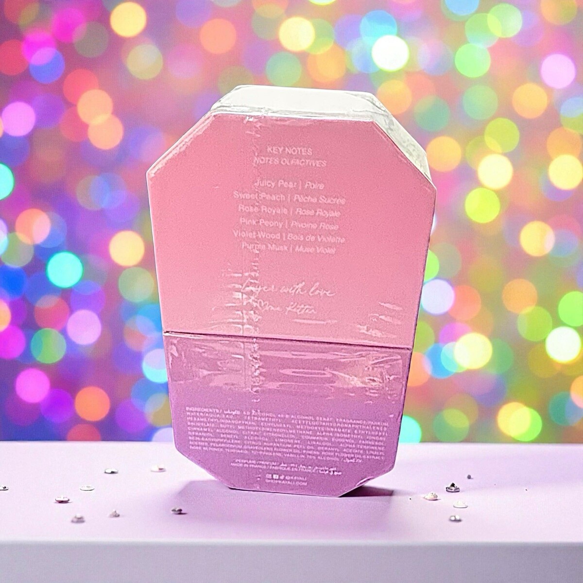 This fragrance combines juicy pear, sweet peach, and enchanting rose with delicate pink peony, violet wood, and purple musk.