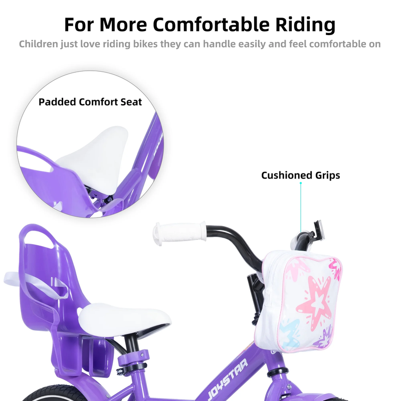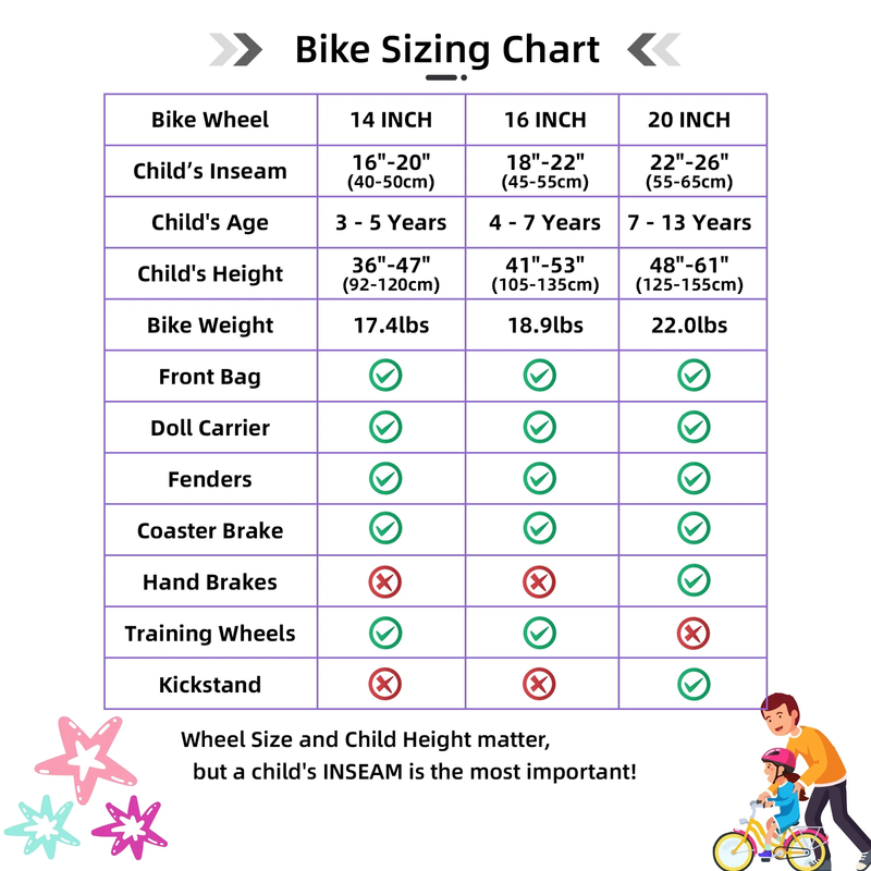 Perfect Size Options for Growing Girls: The Zinnia girls' bike comes in 14", 16", and 20" wheel sizes to suit different ages and heights. Younger riders (14"/16") feature a simple coaster (back-pedal) brake, while the 20" model adds a handbrake and kickstand for enhanced control and convenience. Safe Easy-to-Use Braking System: Smaller bikes (14"/16") have a child-friendly coaster brake for intuitive stopping, while the 20" version includes both coaster and handbrakes to help girls transition to more advanced biking. Adorable Storage Accessories Included: Comes with a charming front basket (handlebar bag) and a rear doll carrier (baby doll seat), encouraging imaginative play and practical storage for snacks or toys. Creative DIY Decals and Safe Chain Guard: Your child will receive a set of DIY decals, allowing them to personalize their bike by adding their name to the frame or chain guard. The chain guard not only protects the chain but also ensures your child's safety, preventing injuries from touching the chain. Size Recommendations for Different Ages: The 14" bike is ideal for children aged 3-5 years (height 36"-47"). The 16" bike is perfect for boys and girls aged 4-7 years (height 41"-53"). The 20" bike is recommended for boys and girls aged 7-13 years (height 48"-61").Child height can vary even at the same age, so please consider your child's height when choosing the right size.