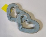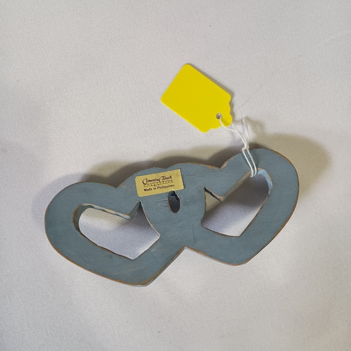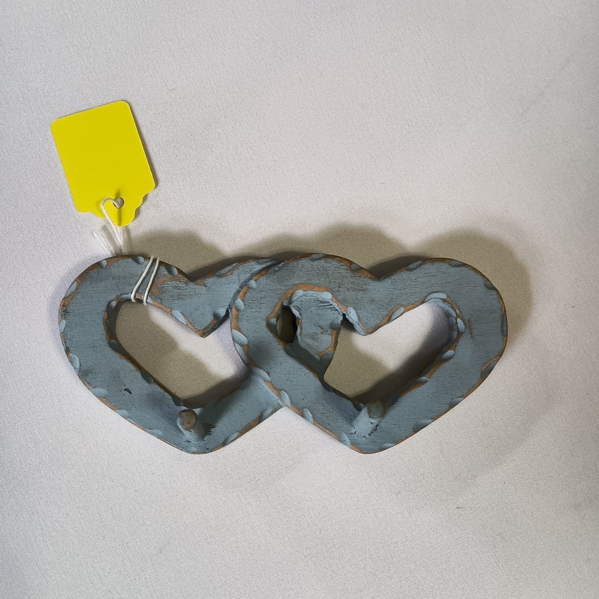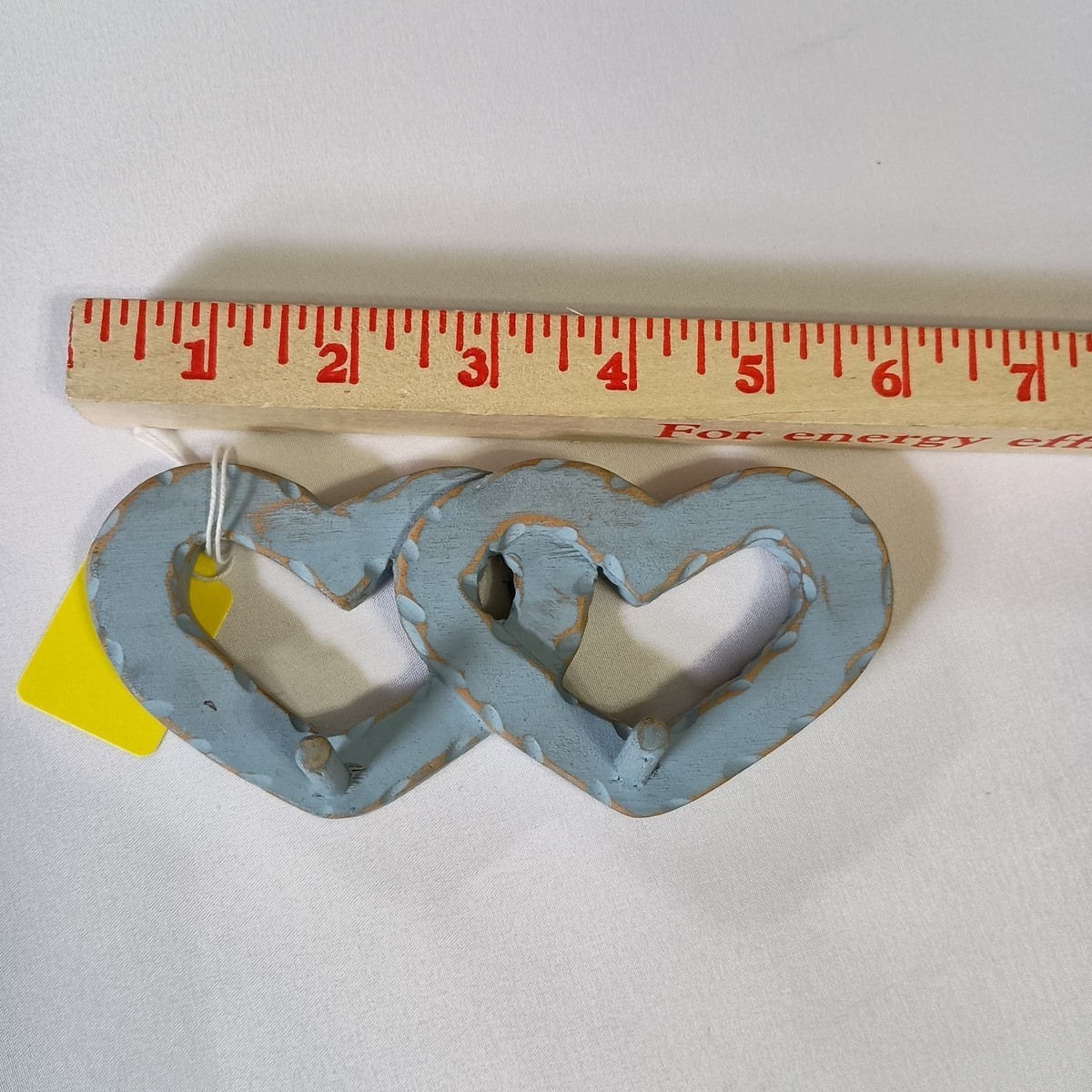 This small wooden decorative hanging rack with double hearts key holder is a perfect addition to your farmhouse style home. The rack is made of medium blue toned wood and has two pegs that can hold your keys or jewelry. The rectangular shape of the rack measures approximately 6" in length and 3" in height, making it a ideal size for any wall mounting. The blue color of the rack adds a touch of rustic charm to your kitchen or dining area. This multipurpose rack is not only functional but also stylish, featuring a farmhouse style design that is perfect for country lovers. Whether you need a place to hang your keys or jewelry, this small wooden rack is the perfect solution. Normal wear See pictures.
