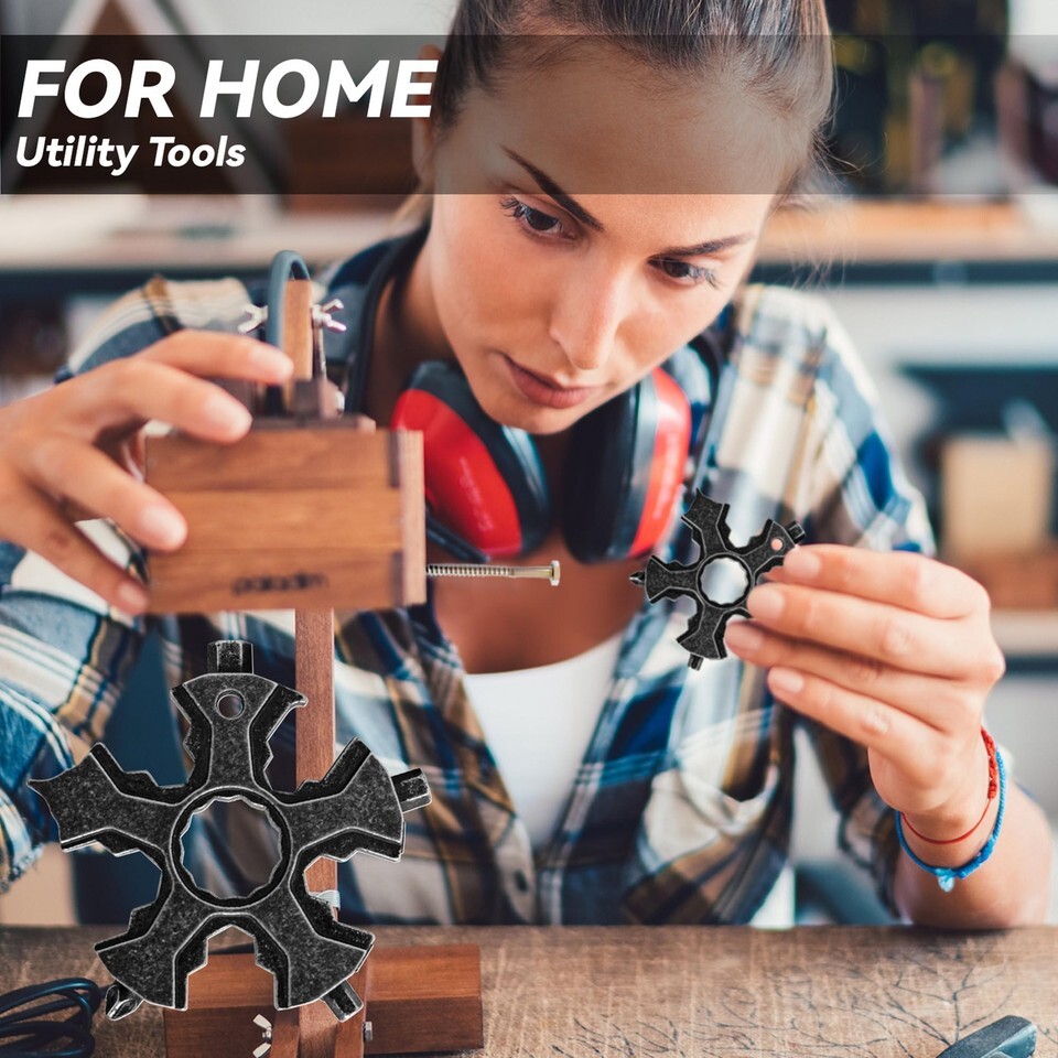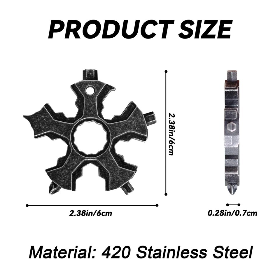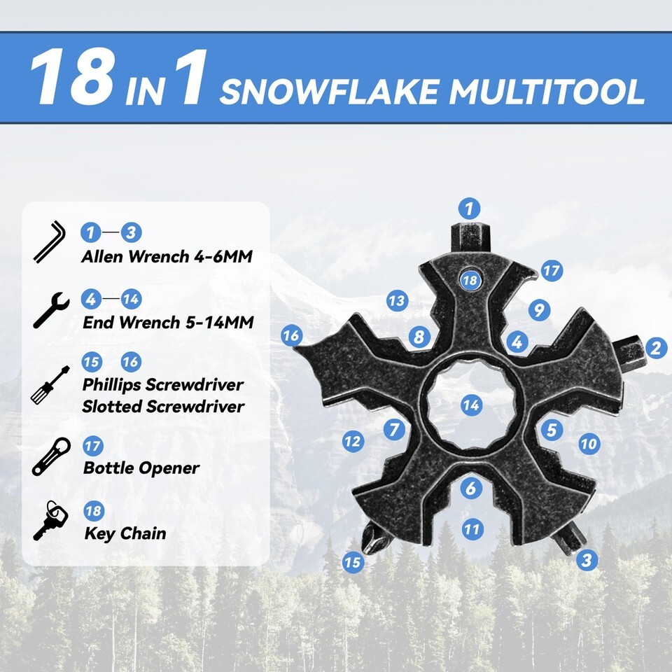 18-IN-1 The snowflake multi tool includes 18 kinds of functional tools, such as hex key, 4mm allen wrench, 5mm allen wrench, 6mm allen wrench, 5-14mm wrenchopen end wrench, phillips screwdriver, slotted screwdriver, flat screwdriver, bottle opener, box cutter, package cutter. HIGH QUALITY The snowflake multitool is made of 420 Premium stainless steel, and the surface is processed with special technology to make it more sturdy and durable, not easy to rust, bend or dull. POCKET SIZE The snowflake multi-tool comes with a key ring, can be hung on keychain or backpack, making it easy to carry outdoors. It is very suitable for camping, riding, cycling, driving, skiing, fishing, climbing, exploring, rescue. AS A GIFT FOR Men, women, him, her, boyfriend, girlfriend, husband, wife, coworker, friend, guy, teens, teenager boys girls, kids, son, daughter, brother,sister, dad, mom, father, mother, step father, grandpa, family, colleague, handyman, maintenance, construction, builder, engineer, woodworker, carpenter, locksmith, mechanic, auto repair, DIY enthusiasts, outdoor EDC. AS PRESENTS AT THE DAY OF Valentine's day, anniversary, birthday, easter, spouse's day, national boyfriend's day, personalized father's day, mothers day, thanksgiving day, halloween christmas stocking stuffers.