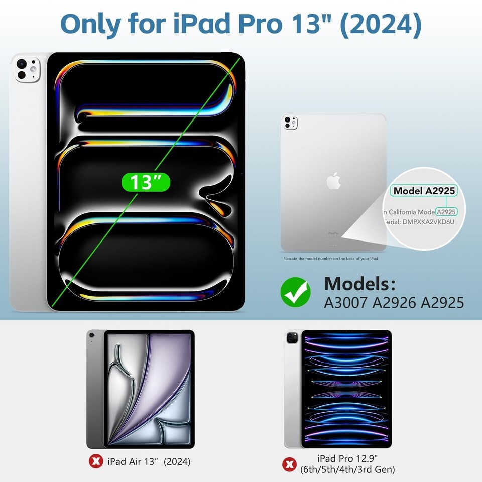 ?Compatibility?For iPad Pro 13 inch (M4) 2024 (Model: A2925 / A2926/ A3007). Before you order, please check the back of the iPad to confirm the model number. NOTE: The Tablet and Pencil are NOT included.