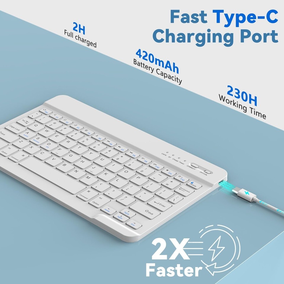 ?Long Life Battery Magnetic Detachable Keyboard Case?Built-in premium Li-ion battery with energy-saving mode, 2-3 hours full charge, works for at least 80 hours, stand by for 130 days. A spring mechanism underneath each key ensures a tactile response with every stroke, helping you to type faster and with less error than on a touchscreen. Please charge it when the keyboard power indicator flashes red