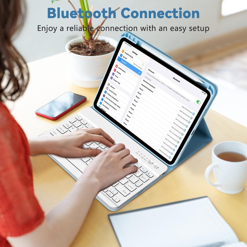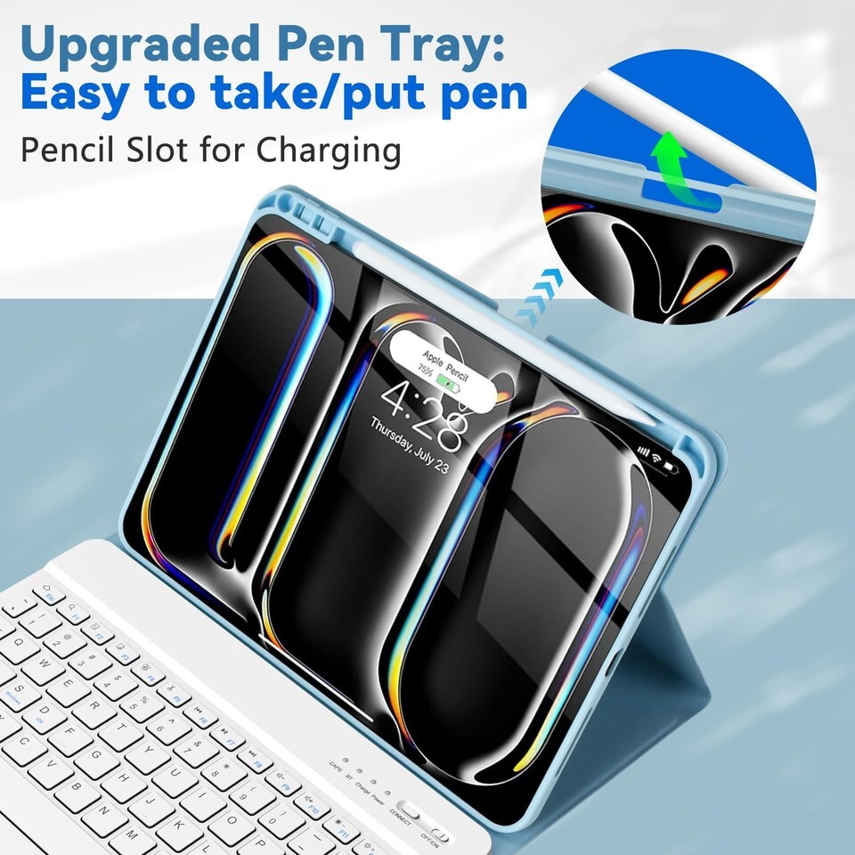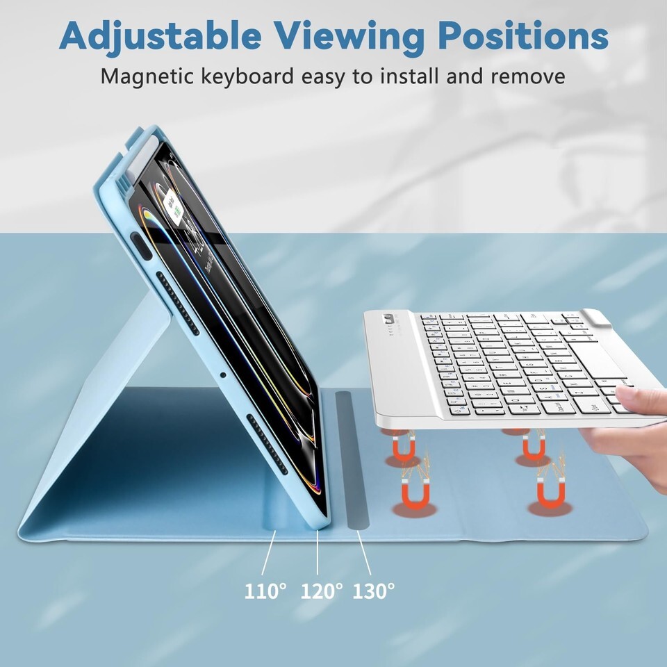 ?Multiple Viewing Angle and Pen Holder?Keyboard Case for iPad Pro 13-inch (M4) is magnetically attached and very versatile and the thoughtful design easily adjusts to whatever comfortable angle suits you best. That makes the iPad work like a laptop, so it's Perfect for working, writing, taking notes, typing, and editing or watching videos. Let you be efficient and do other stuff that needs to get done quickly. It has a pen slot inside to prevent the apple pen from being lost