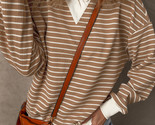 - Khaki Stripe Patched Edge Textured Round Neck Long Sleeve Top