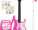 Kids Electric Musical Guitar Play Set, Toy Guitar Starter Kit Bundle W/ 6 Demo Songs, Whammy Bar, Microphone, Amp, AUX, 2 Sticker Sheets - Pink
