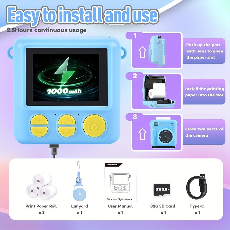 ? Kids Instant Print Camera ? 1080P HD Video + 32GB Memory Card 3 Rolls Paper