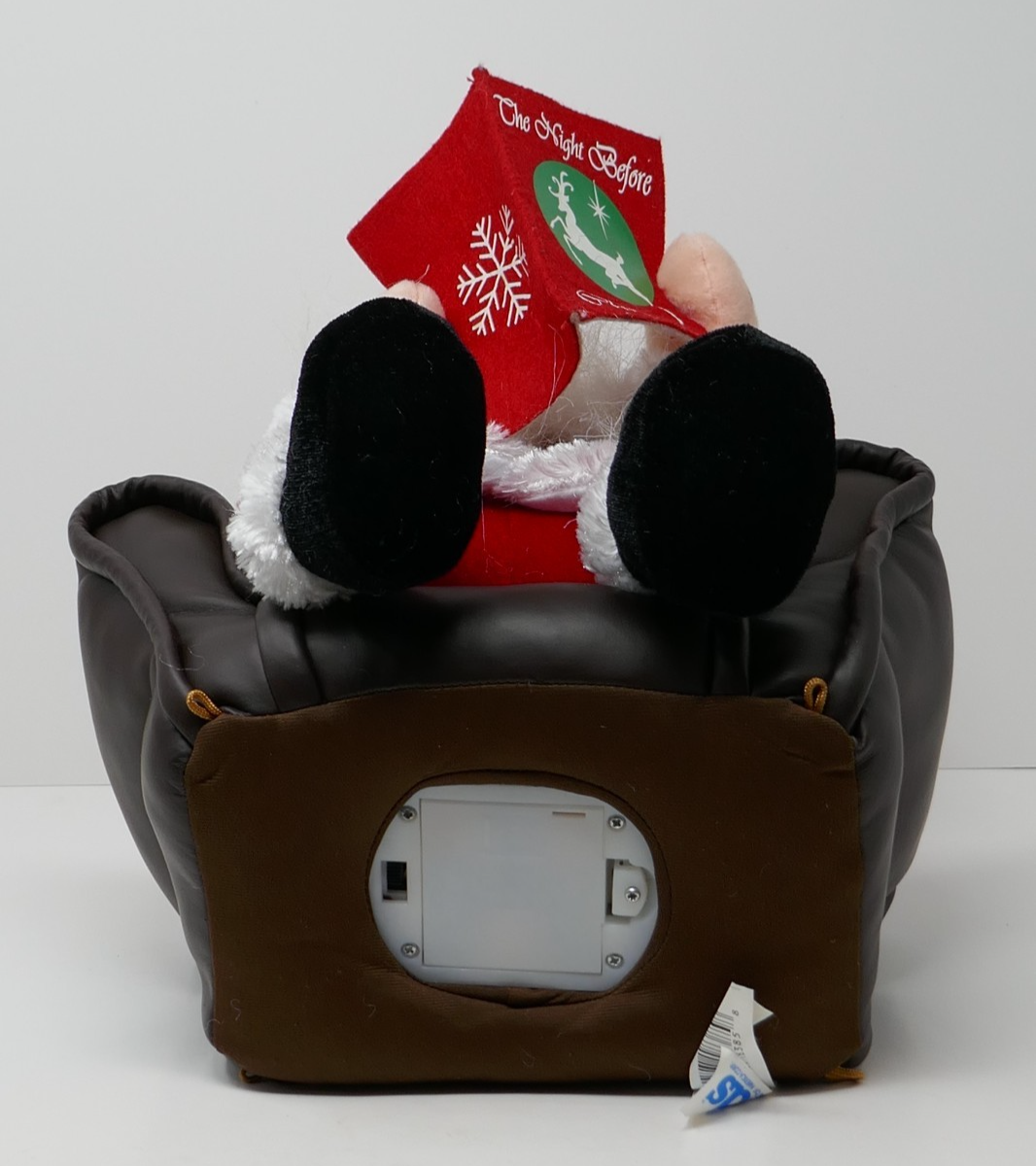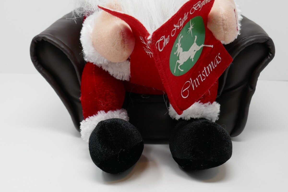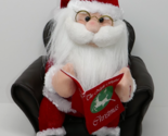This is a Kids Of America 2006 The Night Before Christmas Animated Santa in Chair. He measures approx. 9" wide and 11.5" tall with a few spots on the book and small flaw on his leg. This collectible item features an animated Santa Claus sitting in a chair reading a book, bringing a festive and whimsical touch to the holiday season. Perfect for Christmas celebrations, this animated Santa in chair is a special addition to any holiday decor.