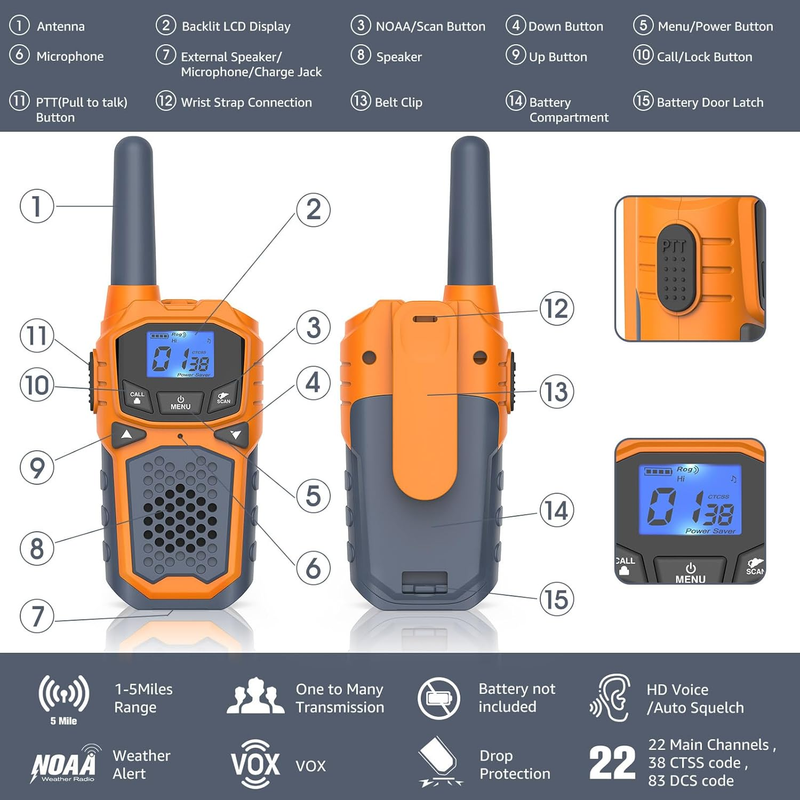 ?Multichannel walkie talkies communication?-one-to-one or one-to-more communication function allow more walkie talkies to communicate on the same channel,It has 22 preset channels, 121 privacy codes (38 CTCSS codes/83 DCS codes), Make your kids enjoy and explore the mysteries!