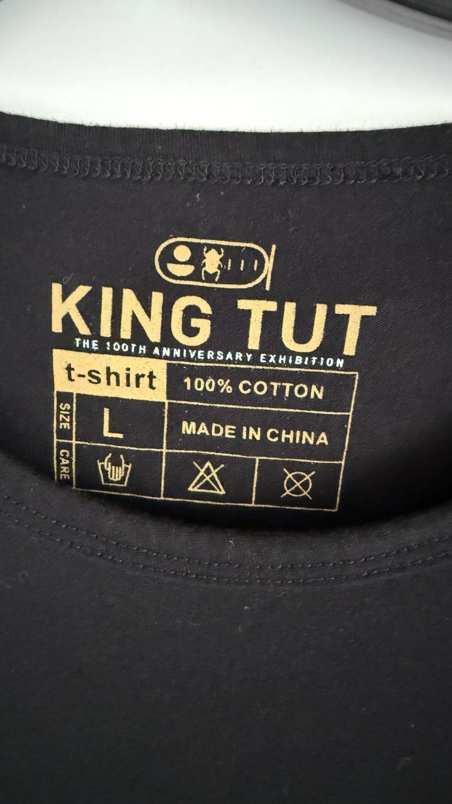 Celebrate the 100th anniversary of the Los Angeles exhibition featuring King Tut with this stylish black t-shirt. Made from 100% cotton with a crew neck and short sleeves, this shirt showcases the iconic pharaoh in a graphic print design. The shirt comes in size small and is perfect for both men and women who appreciate history, ancient civilizations, and unique themes. Represent the legacy of King Tut with this classic and meaningful piece of clothing.