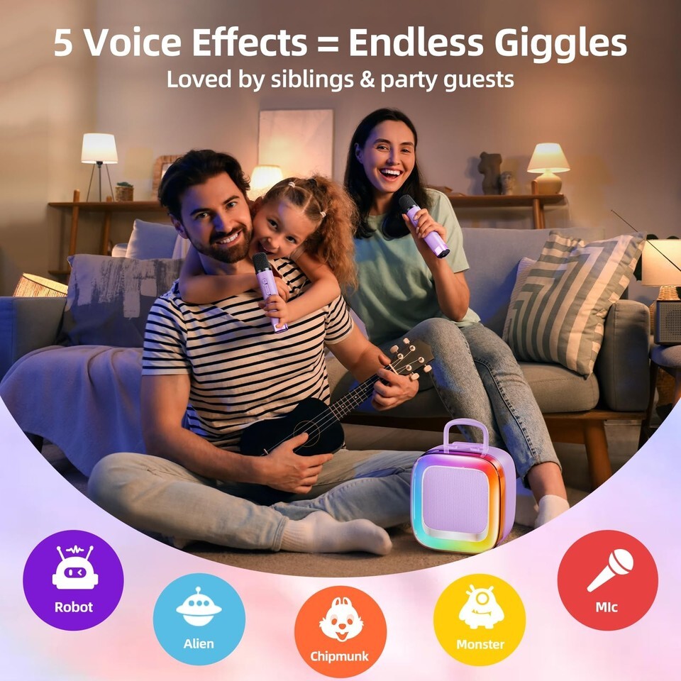 Upgraded Disco Lights + 5 Fun Voice Effects (More Features = More Fun!): Most karaoke machines come with basic lighting, but our LED disco lights sync to the beat for a real concert experience! Plus, we've added 5 exciting voice changers (Robot, Alien, Chipmunk, Monster, and Karaoke Mode) to spark endless creativity.