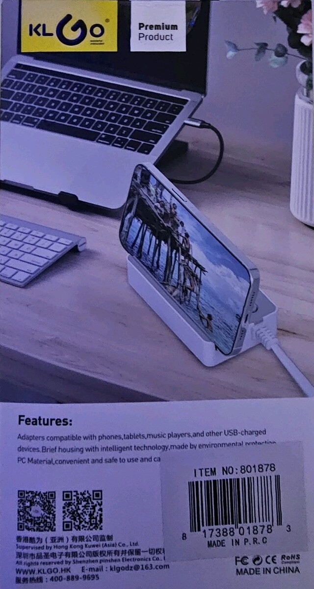 The KLGO 35W 6Port USB 3.0 + PD Power Socket Hub is a versatile adapter unit designed for universal compatibility. With a 1:6 connection split/duplication, this gray hub allows for six separate USB 3.0 connections and provides a powered output of 35W. The compact design, measuring 6.5 inches in length, height, and 2.0 inches in width, makes it easy to use anywhere. The manufacturer warranty of 6 months ensures reliability, and the inclusion of a PD power socket adds extra functionality to this practical and efficient USB hub.