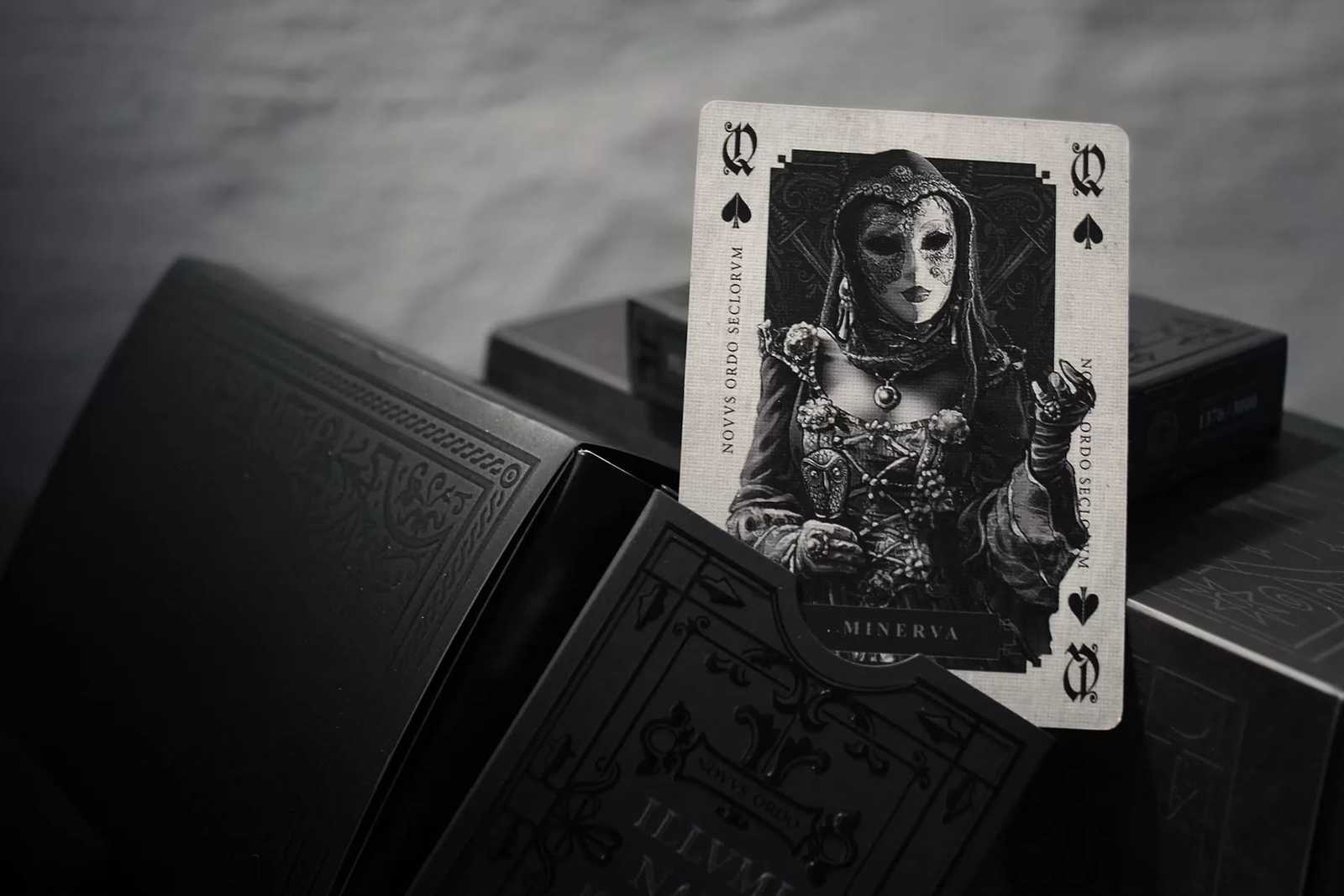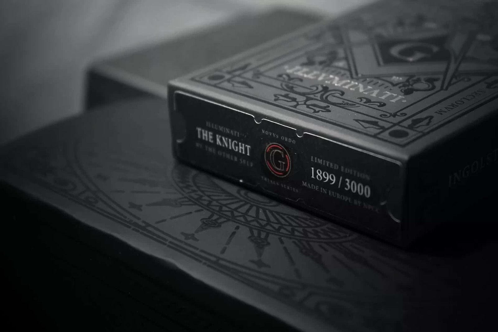 The tuck case of Illuminati Knight Playing Cards is manufactured with special tuck stock, heavily embossed on all sides for a true luxurious feel. The tuck have black and silver application on it, on selected details. The Illuminati is a shadowy organisation of bavarian elites and perfectionists, openly inspired by greek mythology and pantheon. They possess the power and ambition to influence and even orchestrate how history unfolds. Illuminati Knight tuck seal is placed at the bottom of the tuck cases and individually numbered for every Illuminati deck made.