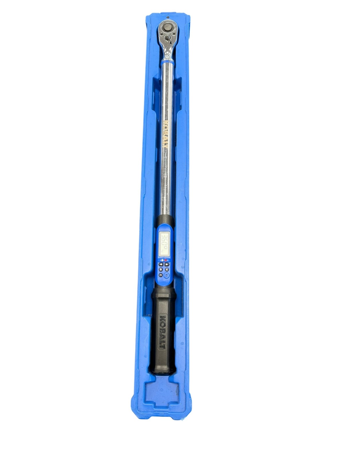 Category: Auto service toolsType: Torque wrenchBrand: KobaltModel number: 2884763Size: ( 12.5-ft/lb to 250-ft/lb )Color: Blue/BlackPower source: Hand-heldDrive Size: 1/2Condition:Used