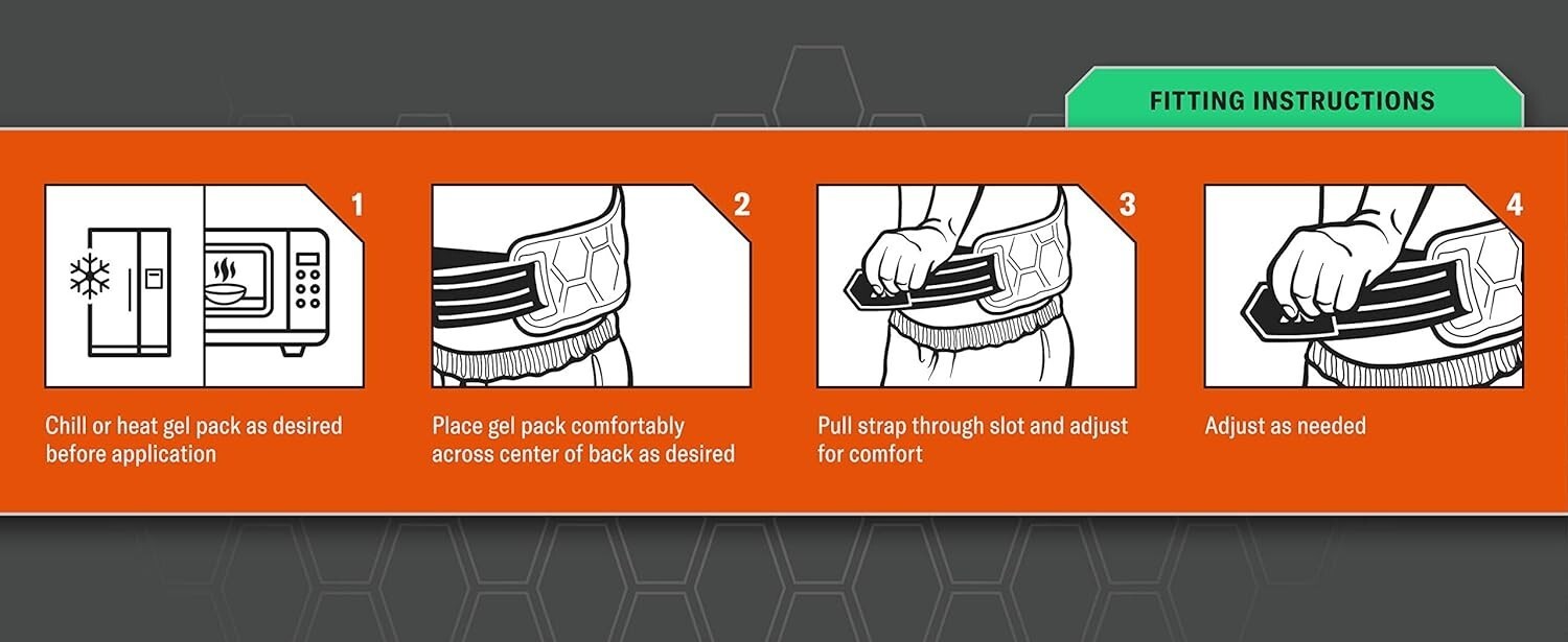 [IDEAL FIT] Size Small measures 16? inches across and fits waist size up to 32? inches. To secure the back gel pack, place it at the pain site, then pull the strap and wrap around the front; finally, adjust the compression level. All KOOL?N FX products are highly adjustable with ULTRA STRETCHY velcro for the PERFECT FIT every time.