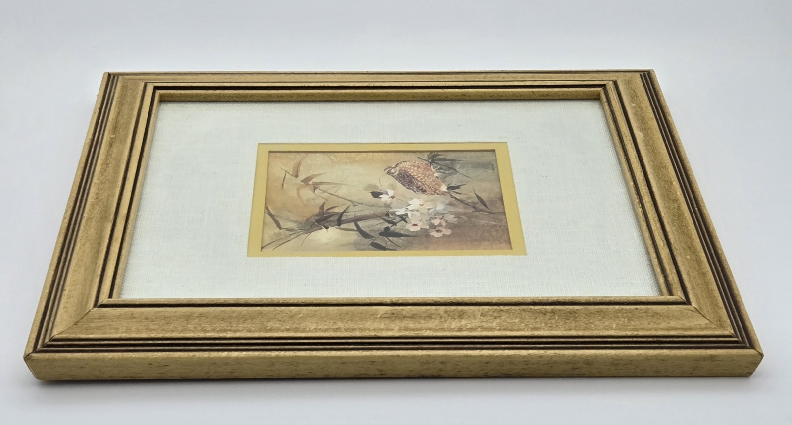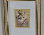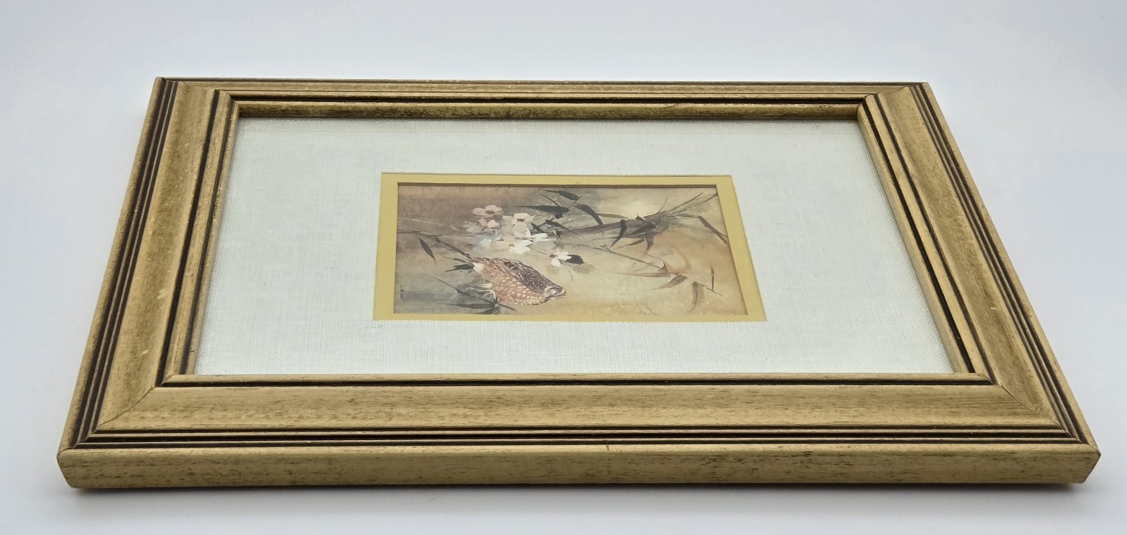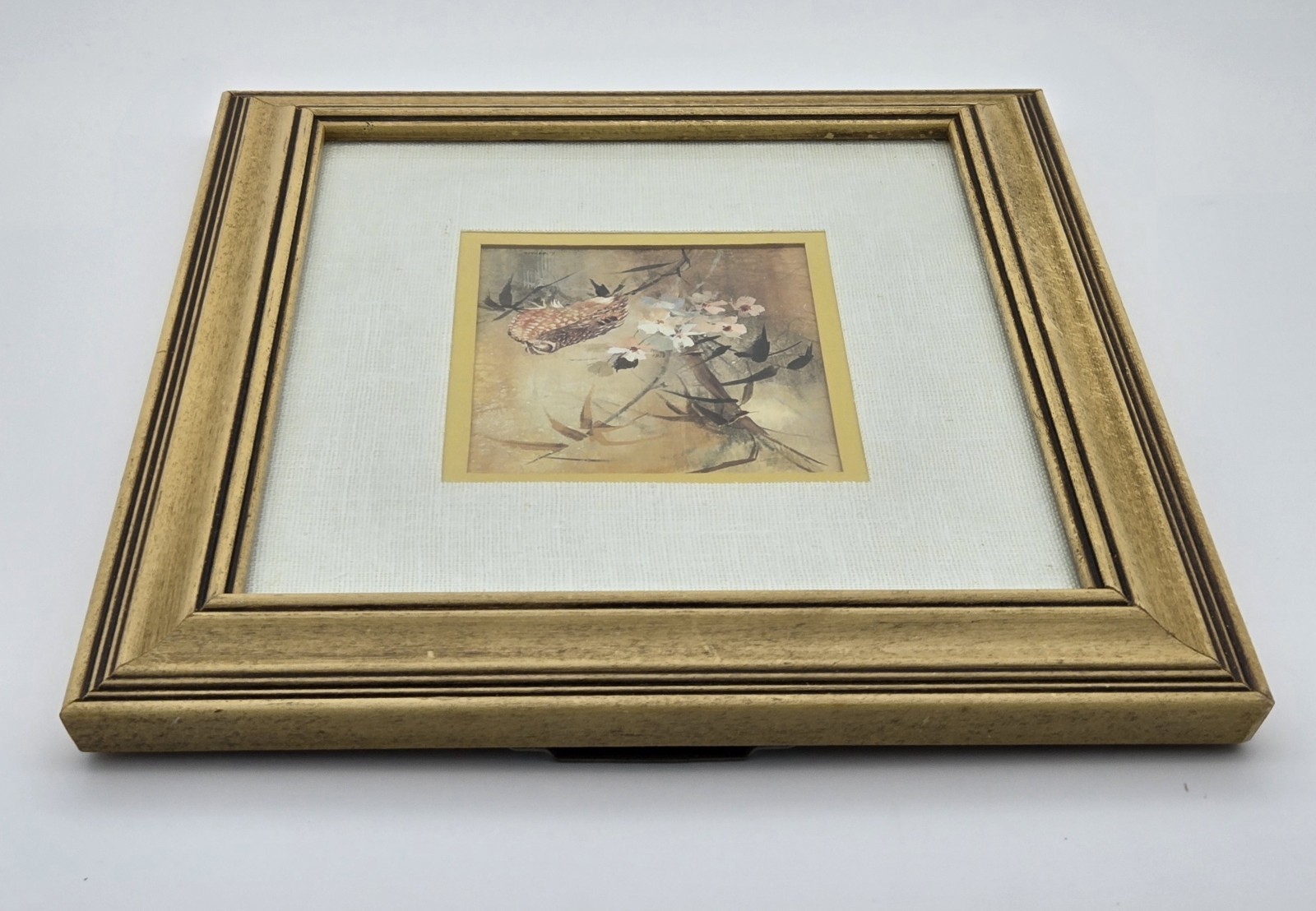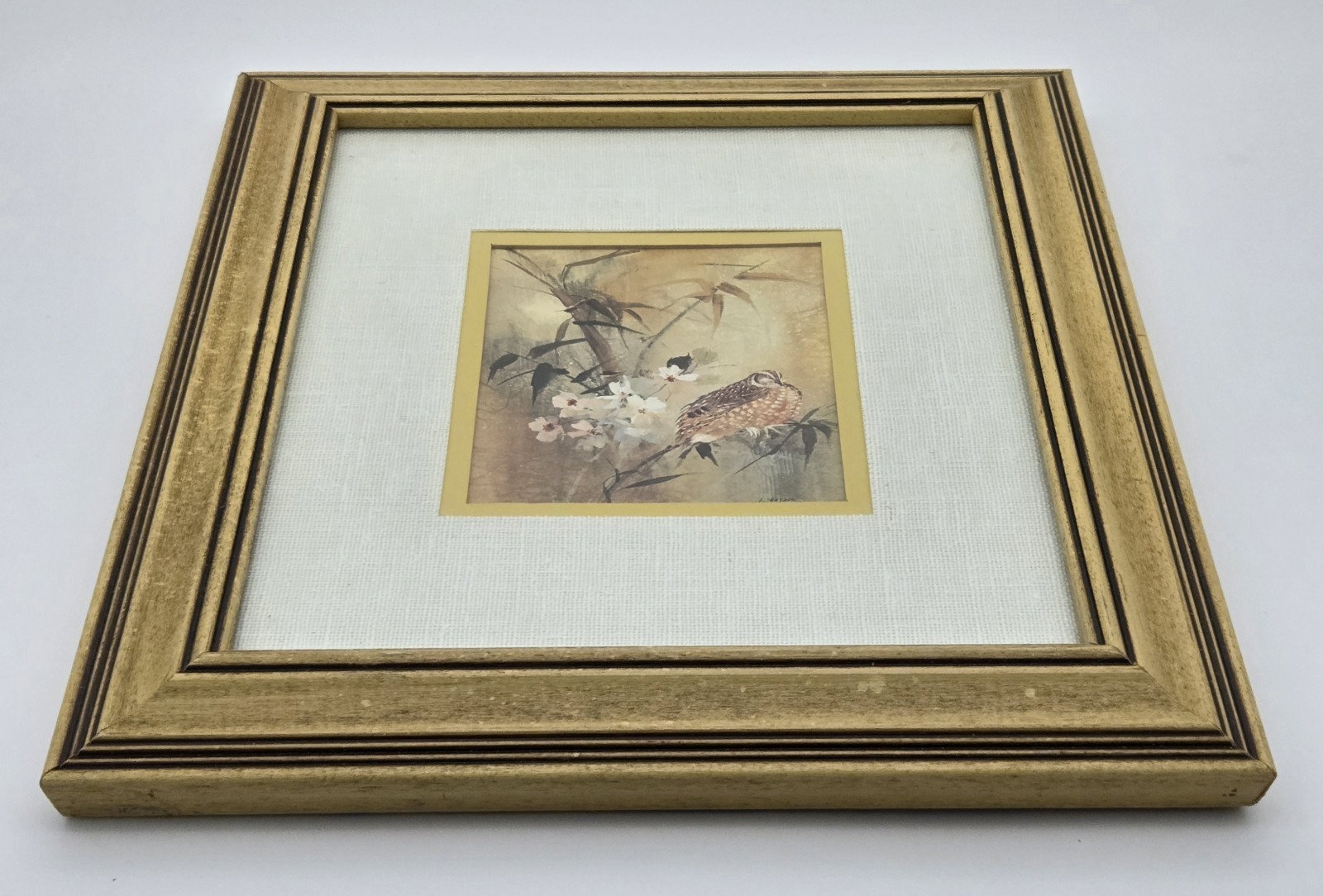 L Gaydos Mid Century Asian Influence Quail Art Framed Gold Linen Mat Wall Decor