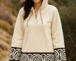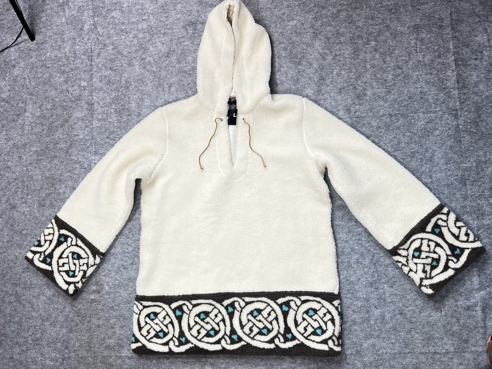 L.O.G.G. Sherpa hoodie, fleece pullover, Nordic pattern hoodie, boho sherpa top, vintage-style hoodie, cozy winter sweater, tribal border fleece, ivory sherpa pullover