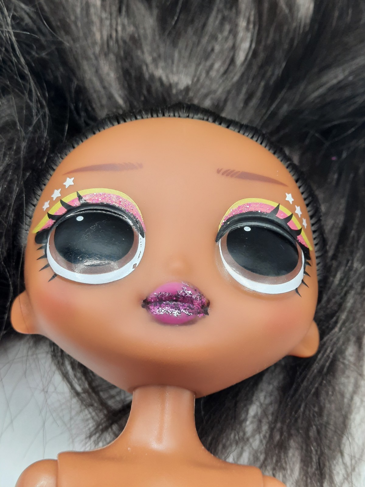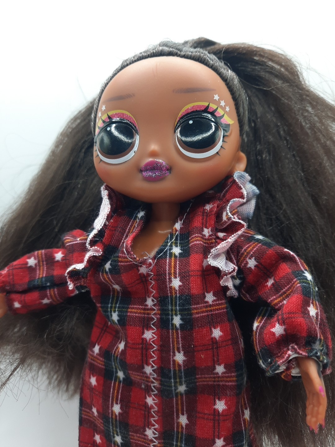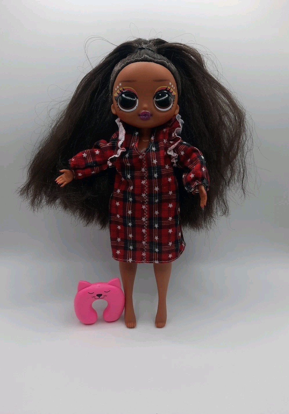 The L.O.L. Surprise! OMG Doll with Pajamas Neck Pillow is a 9.5" fashion doll from the OMG Series by L.O.L. Surprise! The doll features pink and purple hair, blue eyes, and comes with an outfit, shoes, and a detachable neck pillow with black marks. It is designed for all occasions and includes bendable limbs and removable clothes, making it a fun and interactive toy for children. This plastic doll is part of the L.O.L. Surprise! franchise by MGA and is perfect for young girls who enjoy playing with dolls and creating fashionable looks for their dolls.
