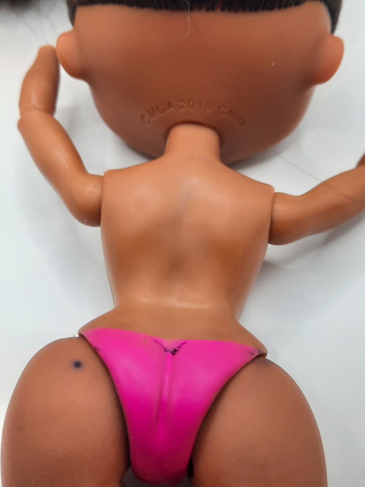 This doll is preowned with a nightgown, Neck Pillow no shoes no earrings, hair was brushed. There is what I think permanent marker around the doll in places. I have tried everything to get the marker off but no luck. In the photos you will see there is Marks on her underhand between legs, there is what looks like a black heart on one of her hands. There are a few marks on her face on the side. I have cleaned them they are there faintly. Also looks like the previous owner tried to change the lip color.