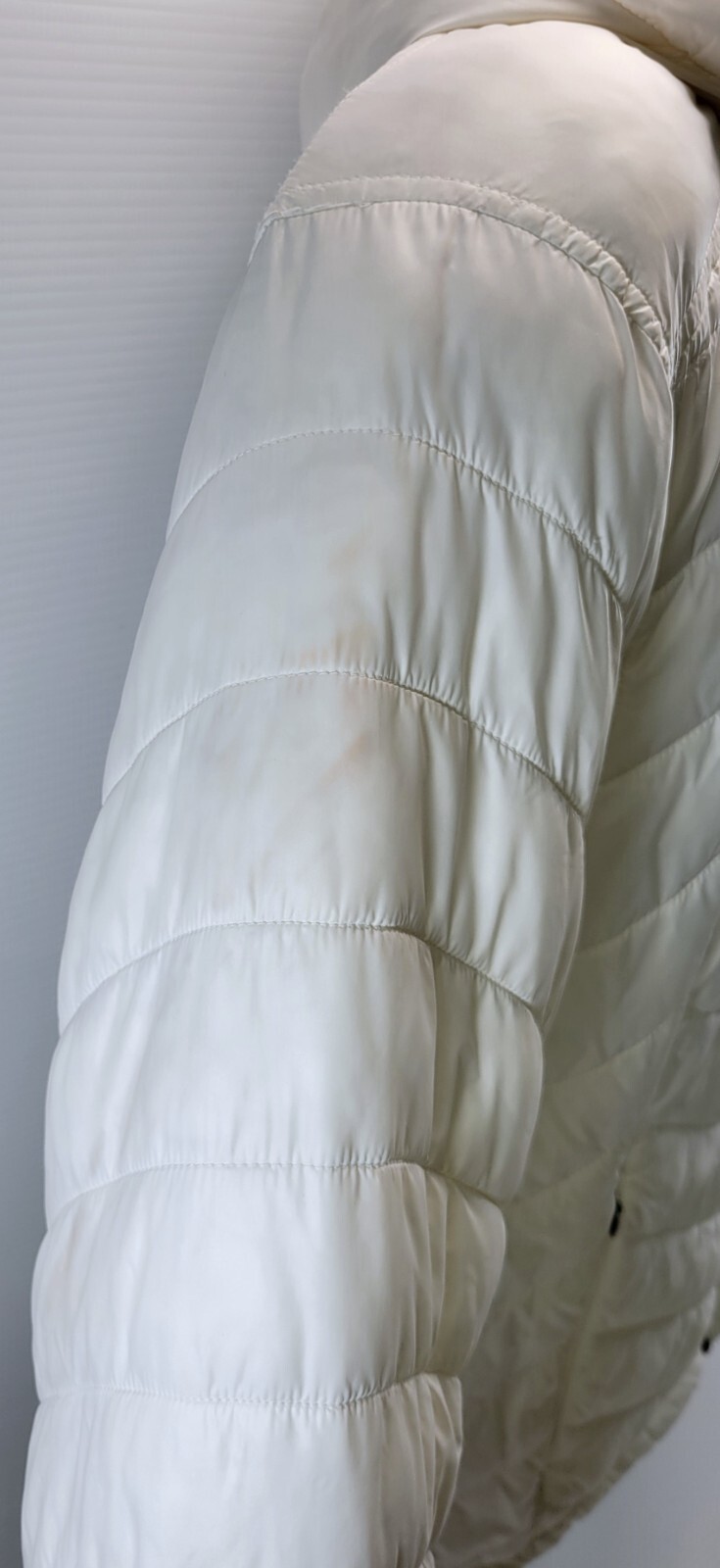 Jacket is in used condition with signs of wear including a mark on the right shoulder from a bag strap. When examined closely, there may be some marks and light stains on light colored fabric but overall still good.