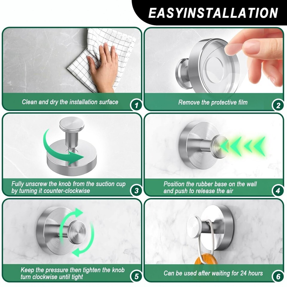 Easy to installJust use the hook on a clean, smooth surface, and by pushing and twisting it a few times, it will generate suction and ensure a secure fixation without the need for drilling. The suction cup hook can be disassembled and reused without leaving any traces or sticky residue. Please refer to the instruction manual for detailed steps