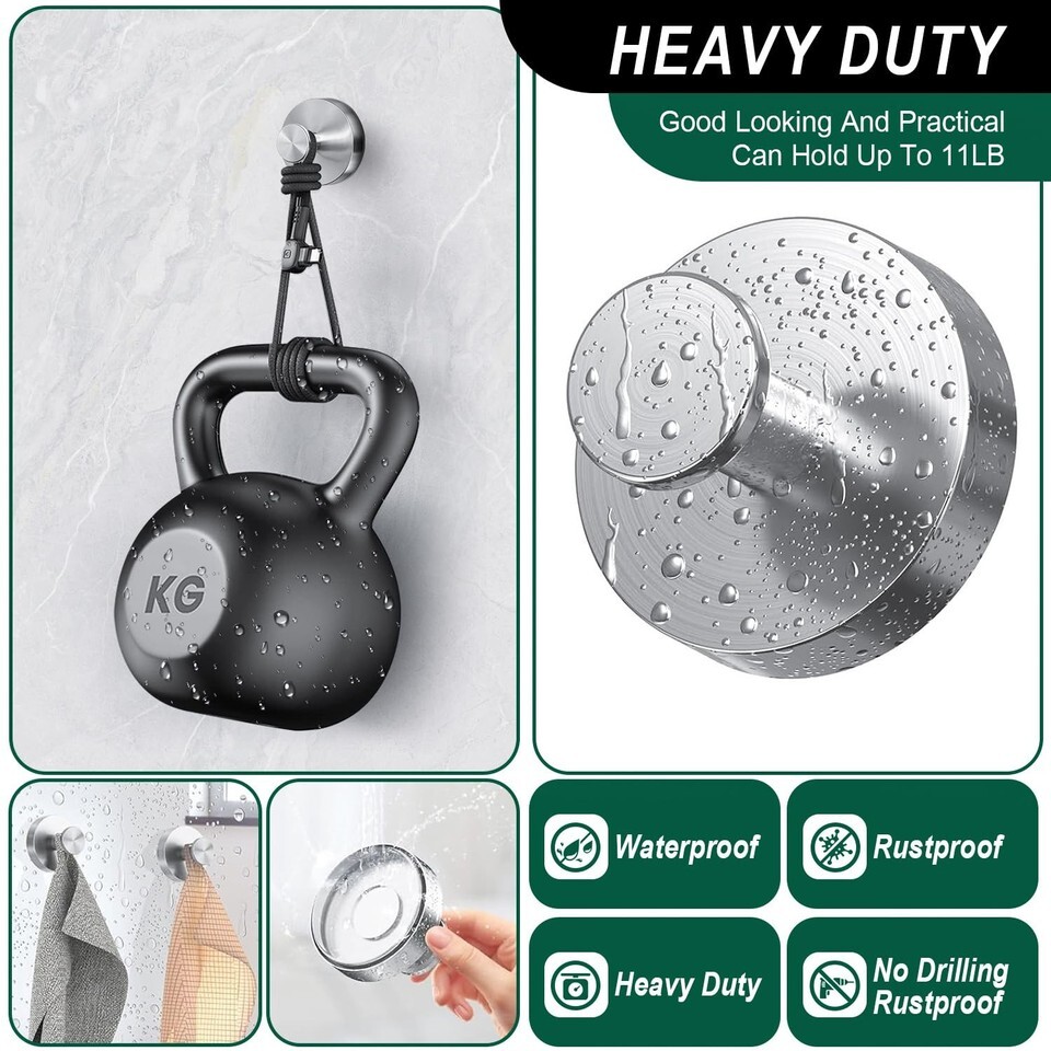 Strong Stability Unlike ordinary suction cup hooks, this shower suction hook base adopts a super adhesive silicone base to better maintain its stability. Turning the knob clockwise releases the air in the base, enhances the pressure of the suction cup, and achieves a strong load-bearing effect. The maximum load-bearing capacity is 11lbs