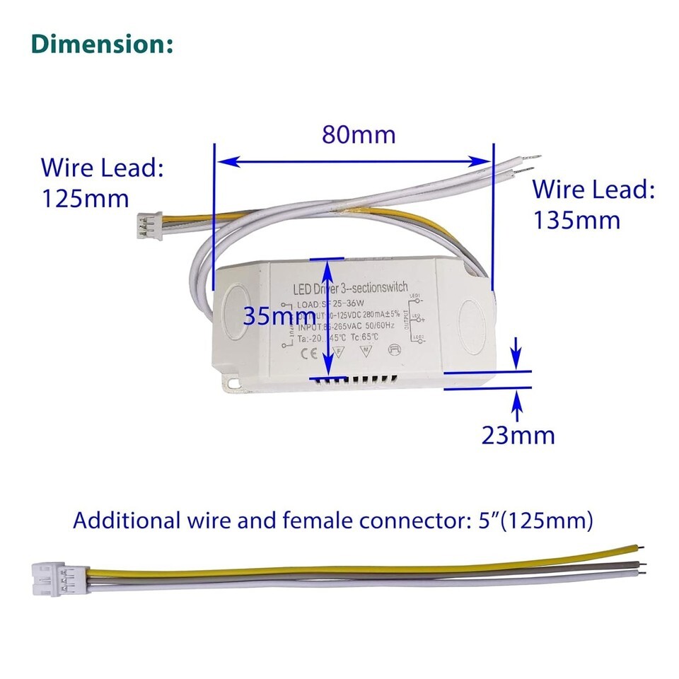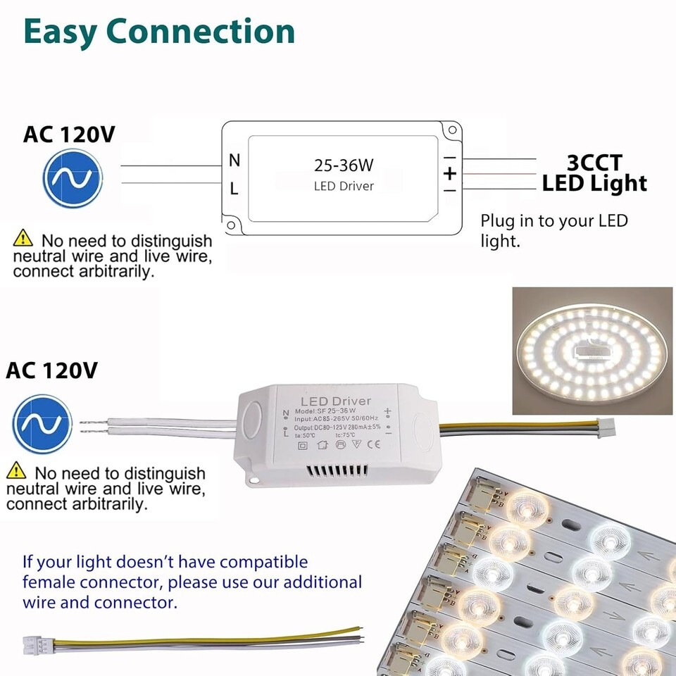 Only use for 3CCT (3 color temperature) LED Light, not for 1CCT; Not dimmable; Output Power: 25~36W; Input voltage: AC85-265V; Output voltage: DC80-125V; Current: 280mA. For dry or damp location use, not for outdoor use.Make sure the maximum wattage of the light does not exceed the max output power of the LED driver.