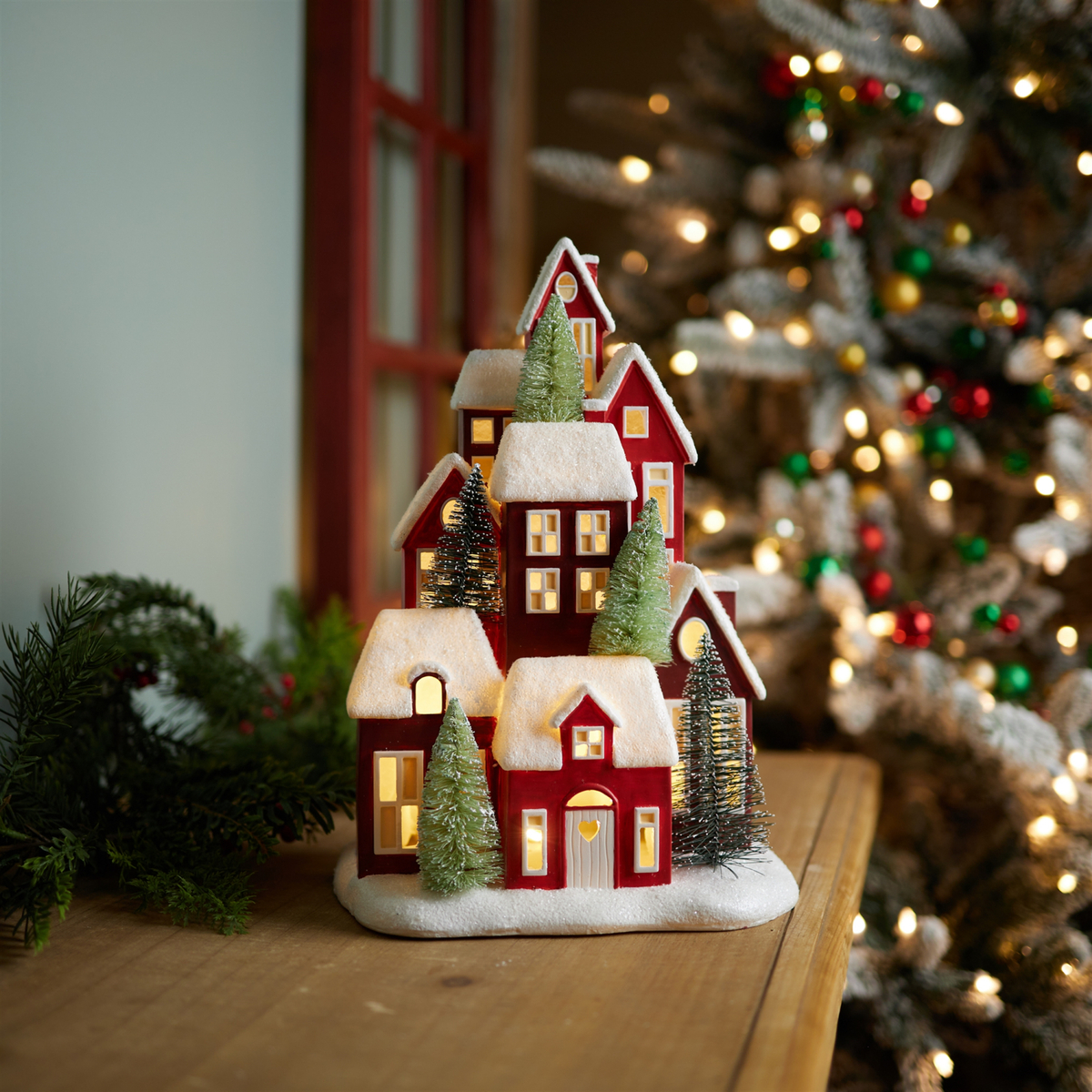 Create a warm holiday glow with this charming cluster of LED houses. Crafted from resin and finished in festive red with snowy rooftops and bottle-brush trees, this piece captures the nostalgia of a cozy winter village. Softly lit from within, it adds magical ambiance to mantels, sideboards, or tabletops, bringing the spirit of the season to life.