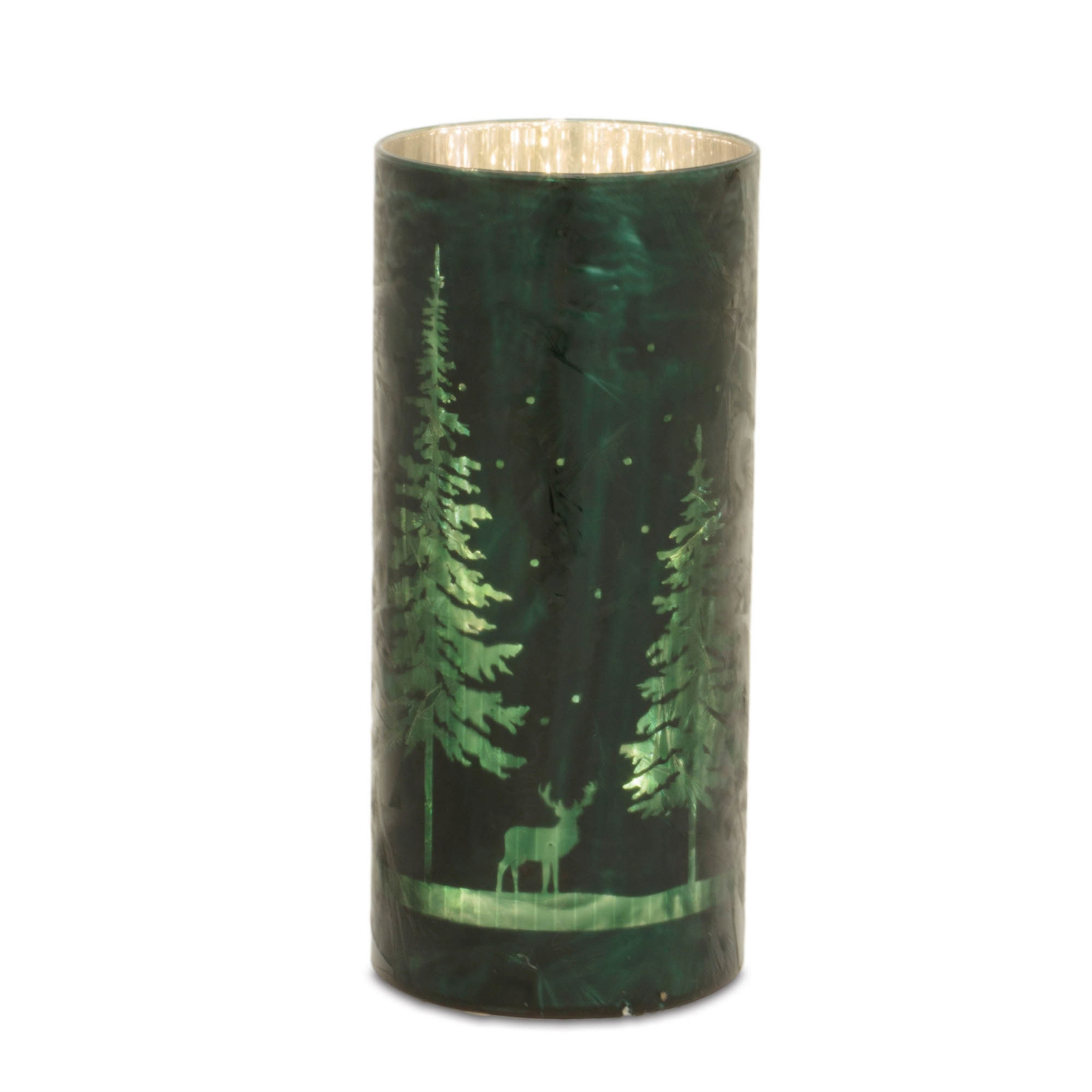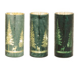 Create a warm and inviting holiday atmosphere with the LED Pine Tree Luminary Set. Featuring wintry green and gold tones, these elegant glass luminaries showcase a pine tree design with rustic deer accents, capturing the essence of a serene winter forest. The warm white LED illumination softly enhances your seasonal decor, making them perfect for tabletops, mantels, or shelves.