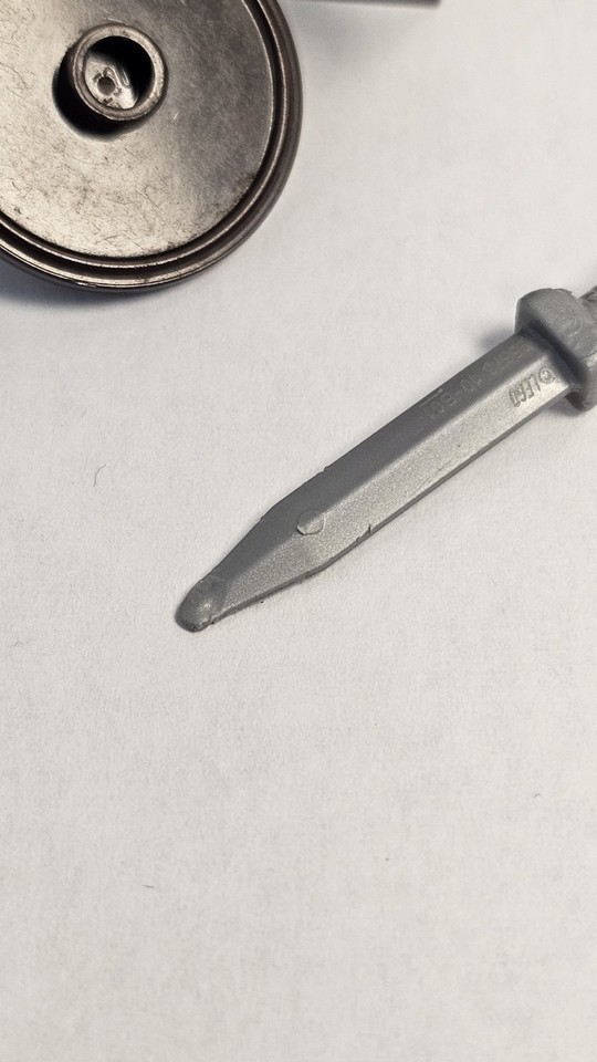 Looks like there is a hairline crack forming near the left elbow, it's very faint (near the mold seam)