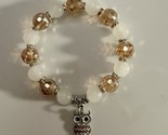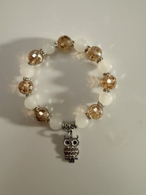 - LT Brown Faceted Bead Stretch Bracelet w/White Gemstone Beads & Silver Owl Charm