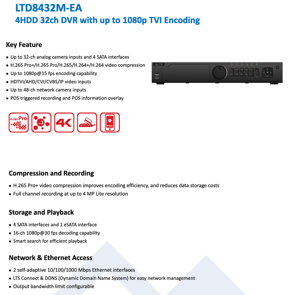 - LTD8432M-EA 32CH 5in1 TVI/CVI/AHD/Analog up to 4MP + 16CH IP upto 6MP 4 SATA DVR