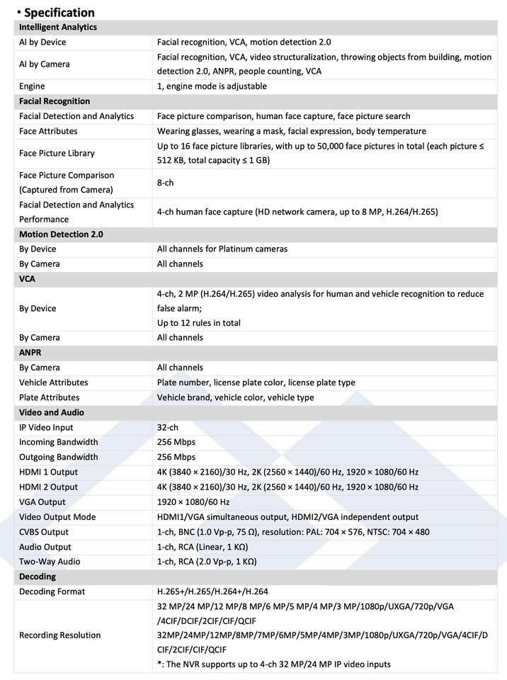 Platinum, NVR, 32 channels, 4K, 256 Mbps, 16 PoE ports, Up to 32 MP recording, 4 x SATA ports for HDDs up to 16 TB each, With Direct Search