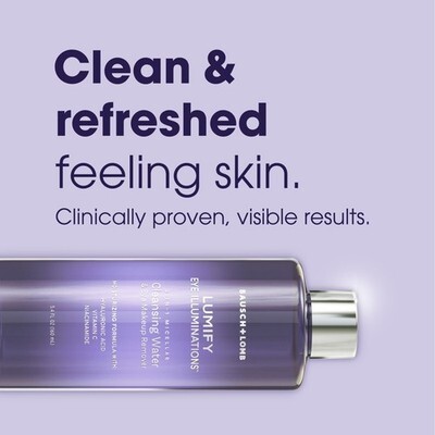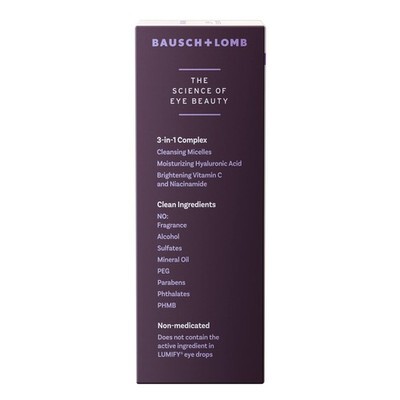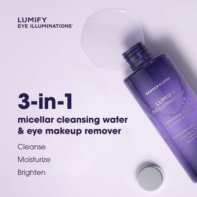 ? 3-in-1 Cleansing Water: A micellar water eye makeup remover with a no-rinse formula. Enriched with Hyaluronic Acid, Vitamin C, and Niacinamide to brighten and hydrate while gently removing eye makeup. ? Waterproof Eye Makeup Remover Eyelid Cleanser: Gently cleanse with micellar water that lifts away makeup, dirt, and oils. A non-irritating eye makeup remover designed for all skin types and the sensitive area around the eyes ? Bausch + Lomb Eye Care: Trusted experts, Bausch + Lomb offers a range of eye products for your eyes. From lubricant eye drops and lens care to eye vitamins and eye allergy relief, Bausch + Lomb has you covered. ? Dermatologist and Ophthalmologist Tested for Safety: LUMIFY Eye Illuminations are developed for the delicate eye area and free of fragrance, alcohol, sulfates, mineral oil, PEG, parabens, phthalates, and PHMB. Gently cleanses without over drying skin. ? Easy Two Step Cleanse: Shake well and soak a cotton ball or pad. Gently wipe over closed eyes to remove dirt, oil, and makeup. No rinsing or harsh rubbing needed. Just clean, refreshed skin. Works to cleanse while removing eye makeup, dirt, and excess oil.