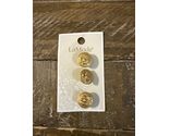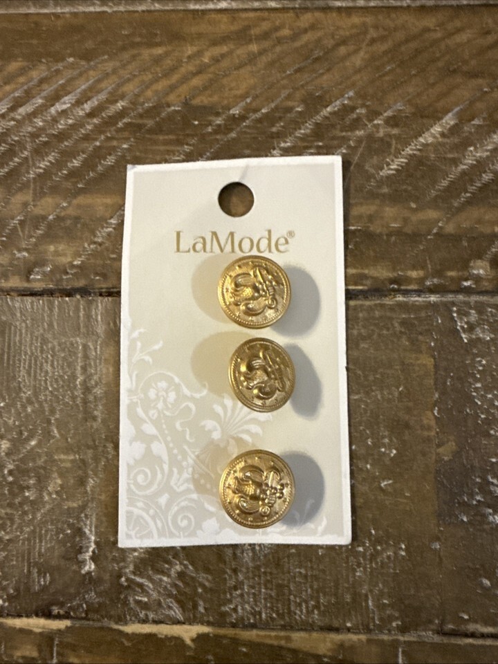 The LaMode Buttons 3 Piece 5/8" in gold color are made of plastic material. These buttons are perfect for sewing and crafts, offering a versatile and elegant closure option for various projects. With the intricate design and high-quality materials, these buttons add a touch of sophistication to any creation.