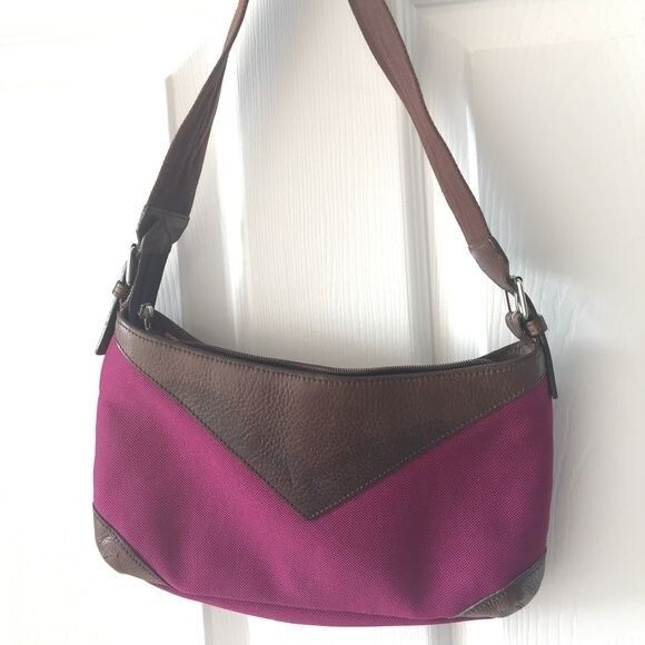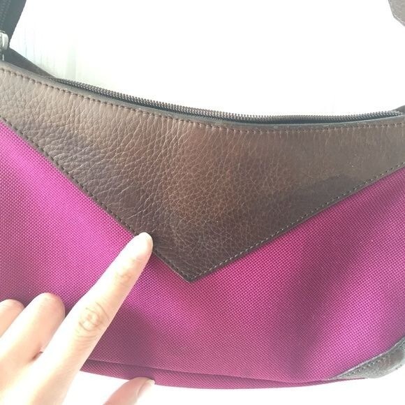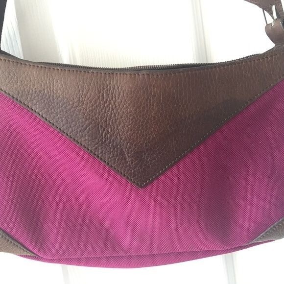 - Lacoste Canvas Leather Handbag Purse Shoulder Strap Brown Purple