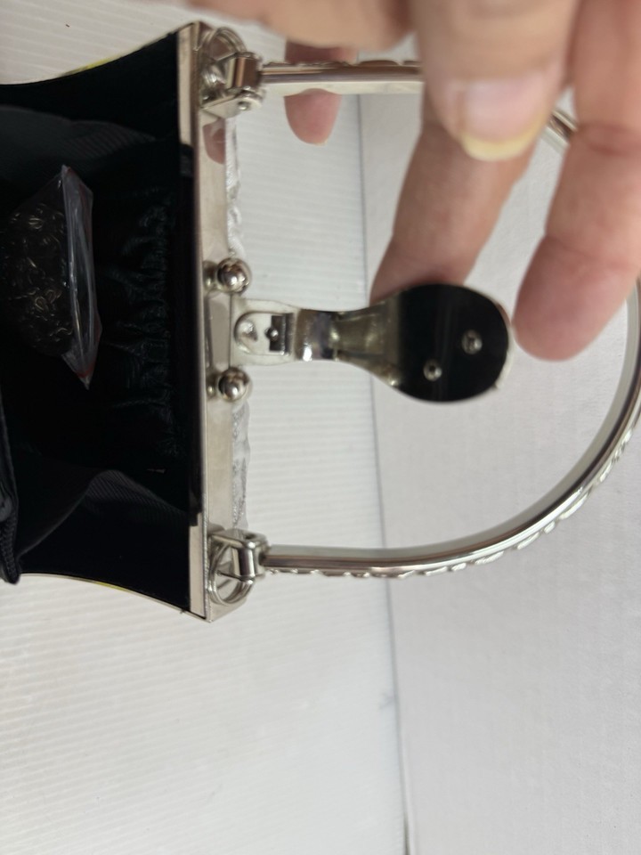 Sliver textured exterior and black color interior. with metal handle and 23" long chain to attach.