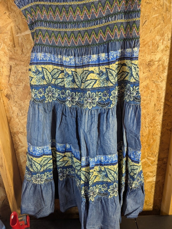 This ladies medium size cotton bohemian style skirt features a floral pattern, pull on closure, and a knee-length peasant style. Made of lightweight and stretchy denim fabric, this vintage-inspired skirt is perfect for various occasions such as travel, parties, or casual outings. With an elastic waist for comfort and effortless styling, this multicolor skirt is ideal for the summer, fall, and spring seasons. Designed for regular size women, this skirt adds a touch of bohemian chic to any wardrobe. 30" waist and 30" length