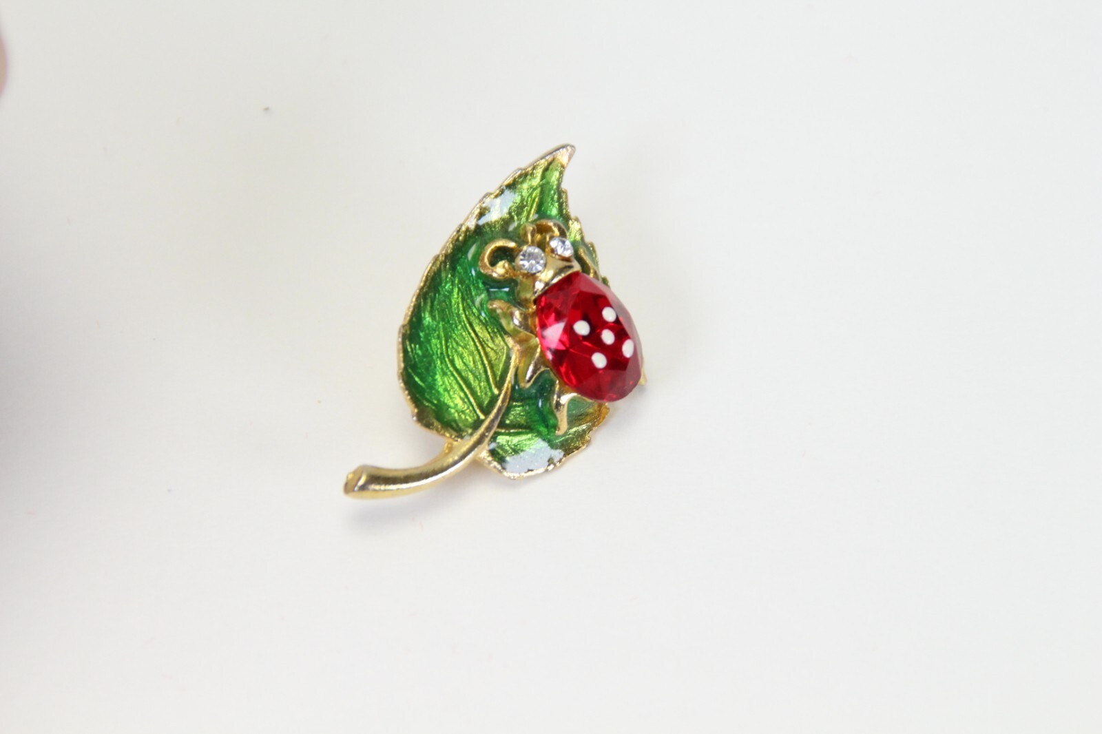 - Ladybug Pin Jewelry Green Enamel Leaf Rhinestone .8" W x 1.25" H Spring Time